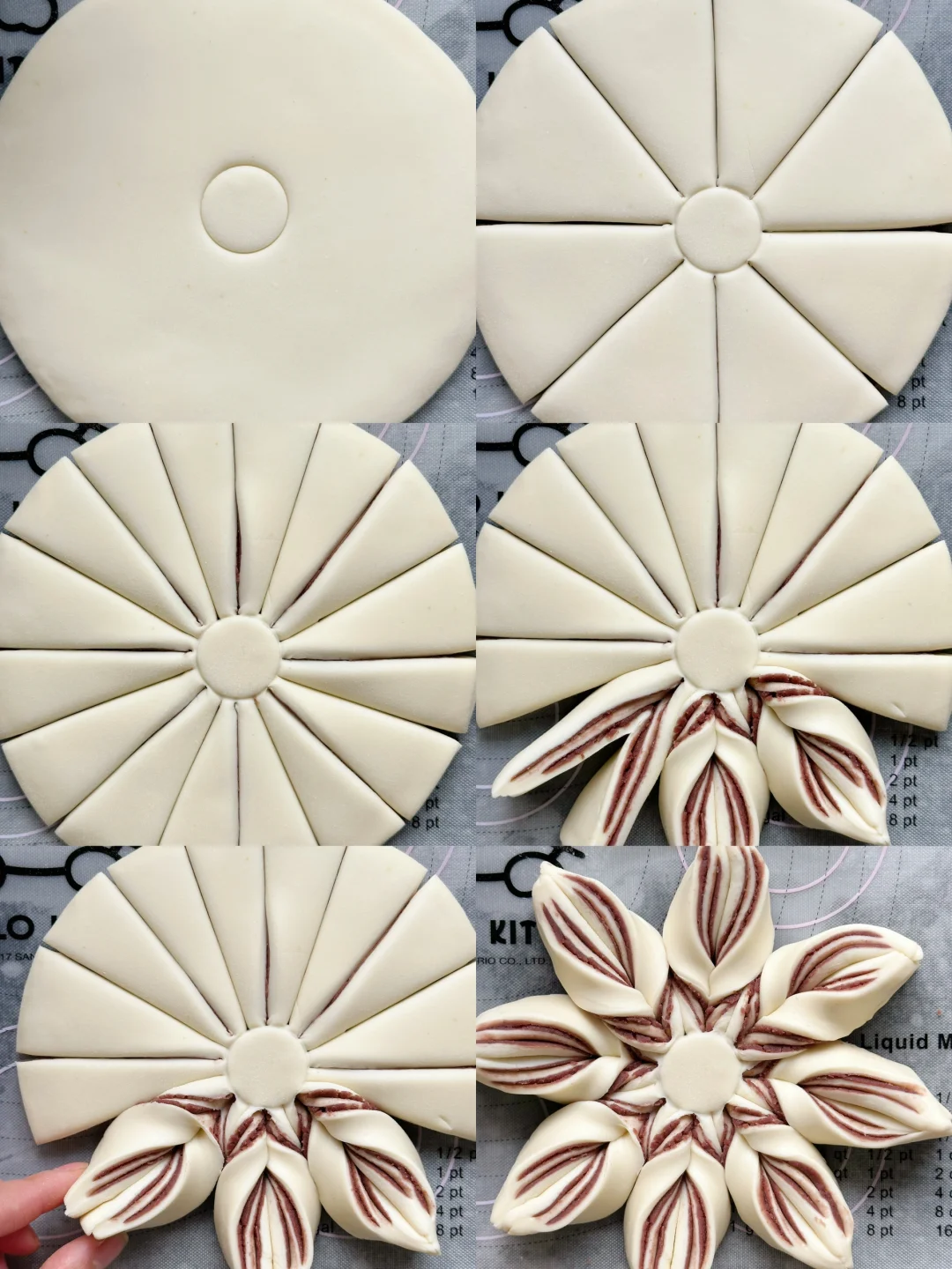 5️⃣中间放一个直径5cm左右的圆,均分成八等份,再每份均分成两份,一共16等份。每两份为一组向外扭三圈捏紧收口;