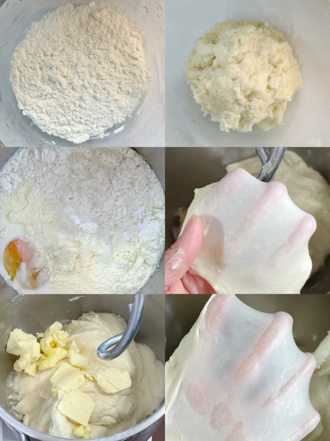 🔹主面团:高筋粉230g,低筋粉40g,盐4g,糖25g,奶粉12g,耐高糖酵母3g,全蛋液25g,牛奶185g,黄油20g,烫种55g