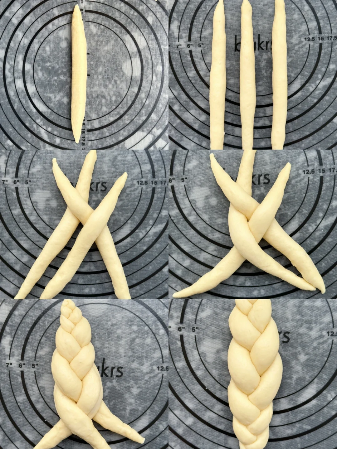 6️⃣取一个松弛好的面团按压排气,擀成牛蛇状,翻面横放,底部打薄,从上至下卷起,收口捏紧,搓长,3个一组编成麻花状,两头捏紧。