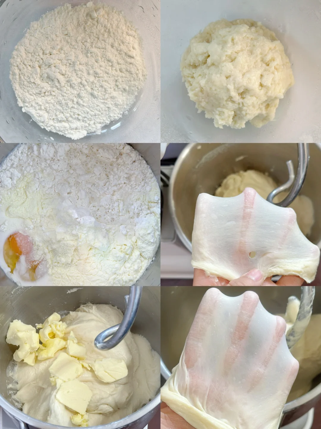 2️⃣将主面团中除黄油外的所有食材放入厨师机桶内,厨师机1或2档搅拌至无干粉,切换至5~6档打至能扯出厚膜,加入软化好的黄油开3档揉至黄油吸收,再切换至5-6档揉至能扯出薄膜即可。