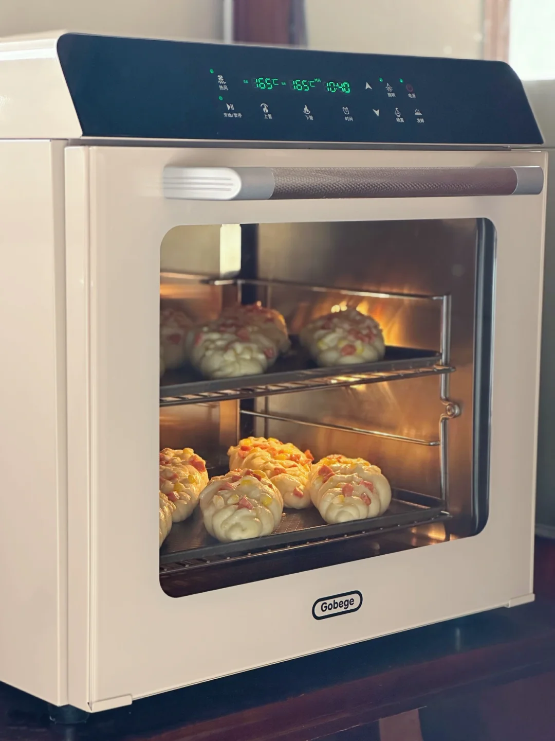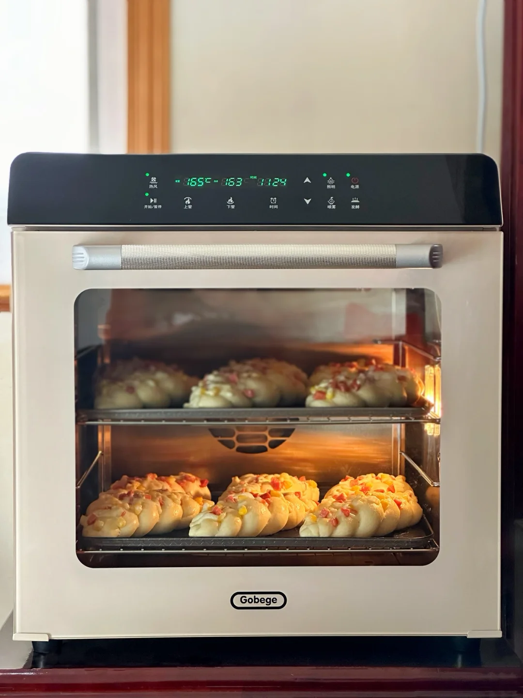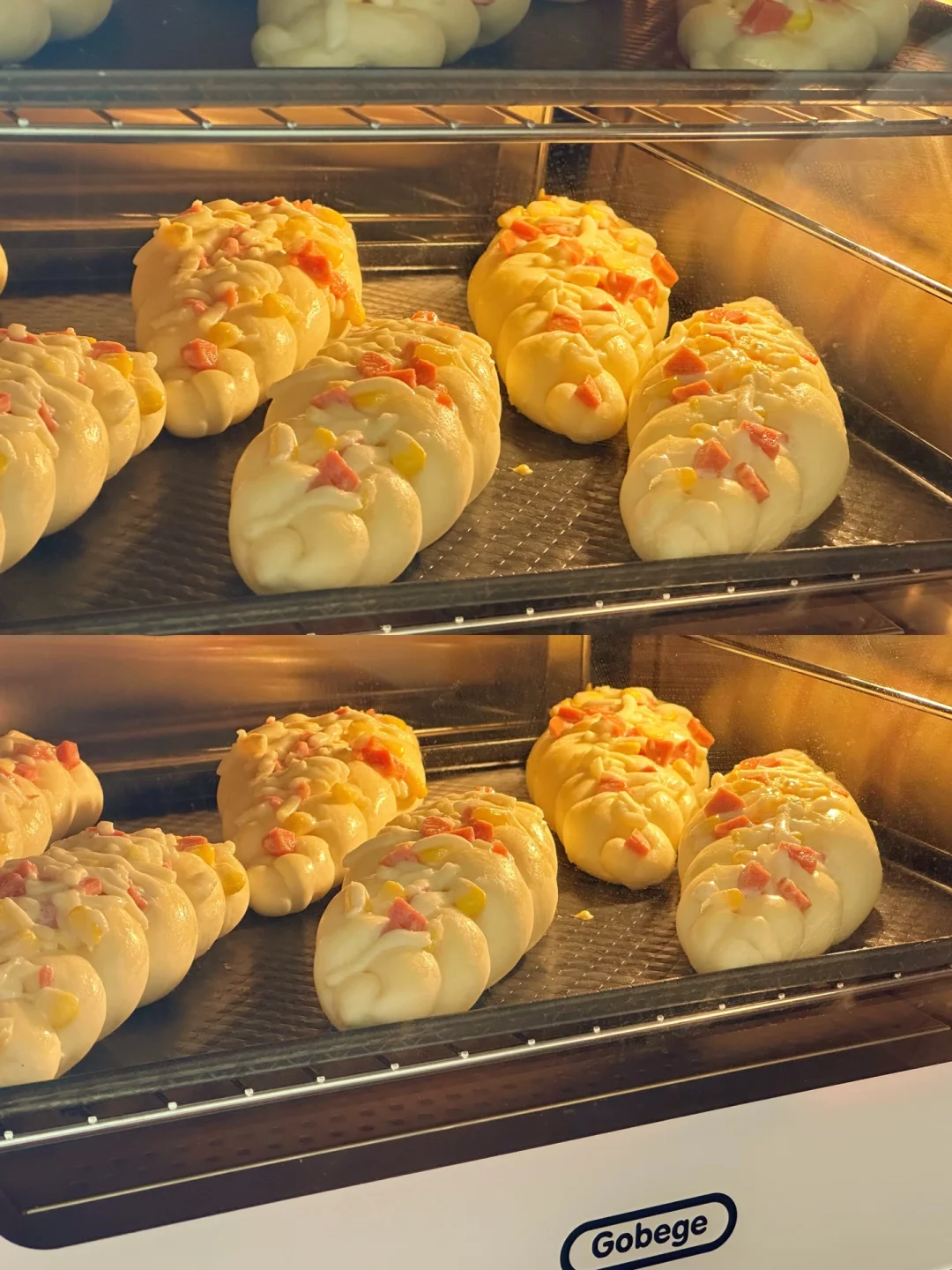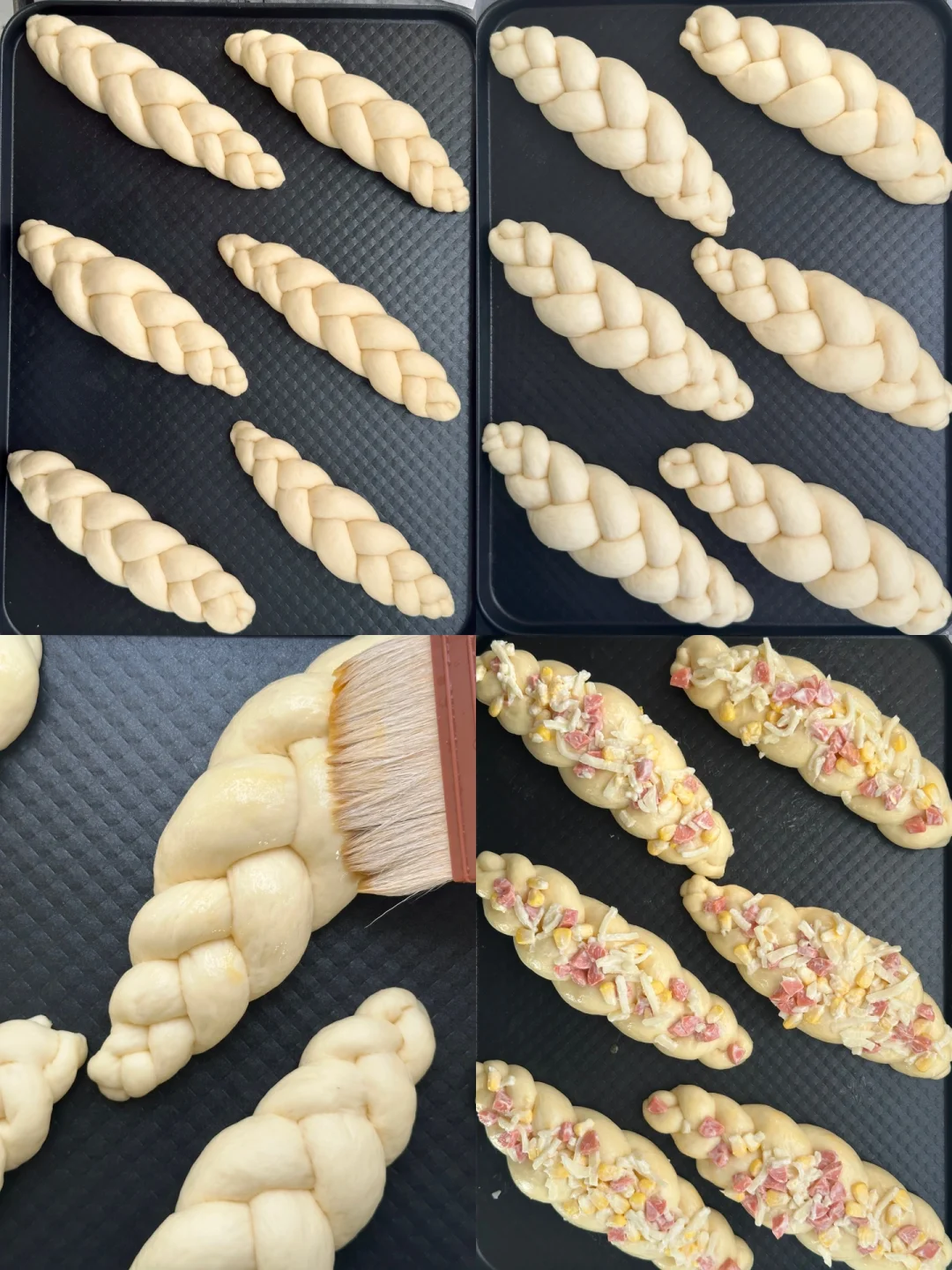 7️⃣依次做好, 在温度32°C左右,湿度80%的环境下发酵至两倍大,发酵好后表面刷蛋液,放上馅料,烤箱提前预热,放入预热好的80s烤箱风炉模式165度烘烤15分钟左右。