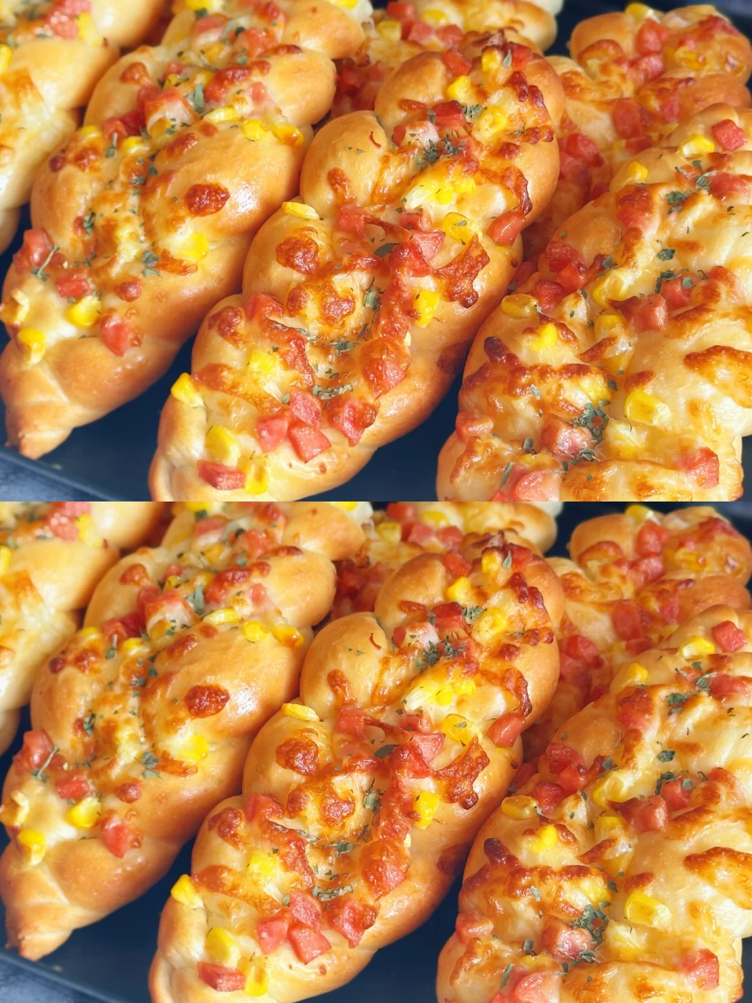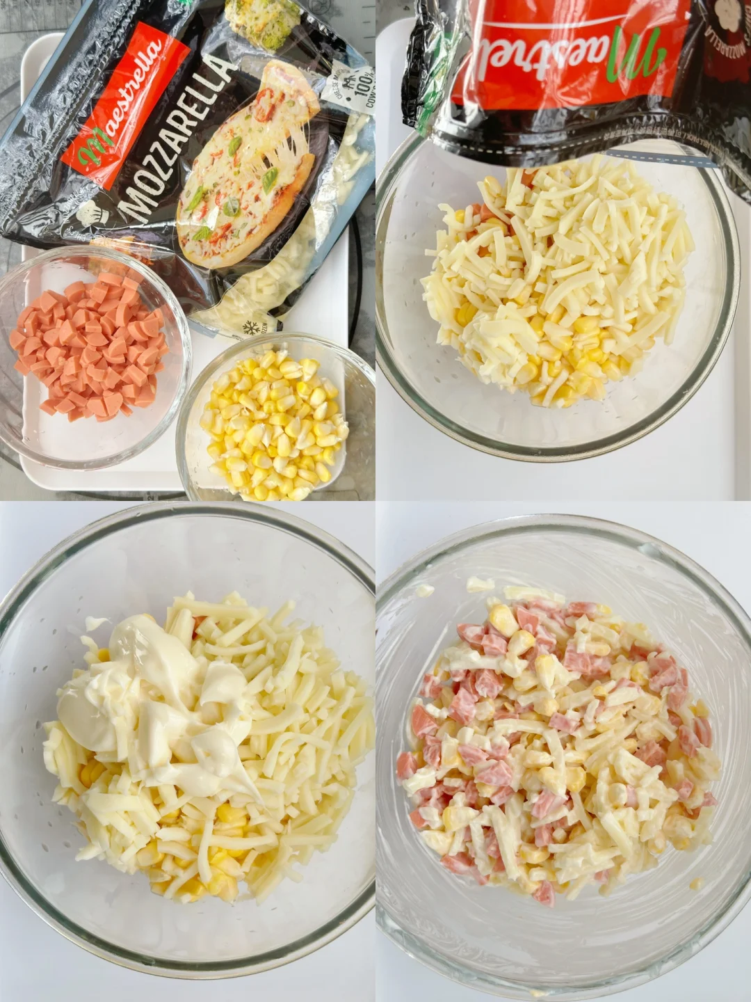 🔸馅料:马苏大师 马苏里拉芝士碎100g,火腿肠100g,玉米粒100g,沙拉酱60g