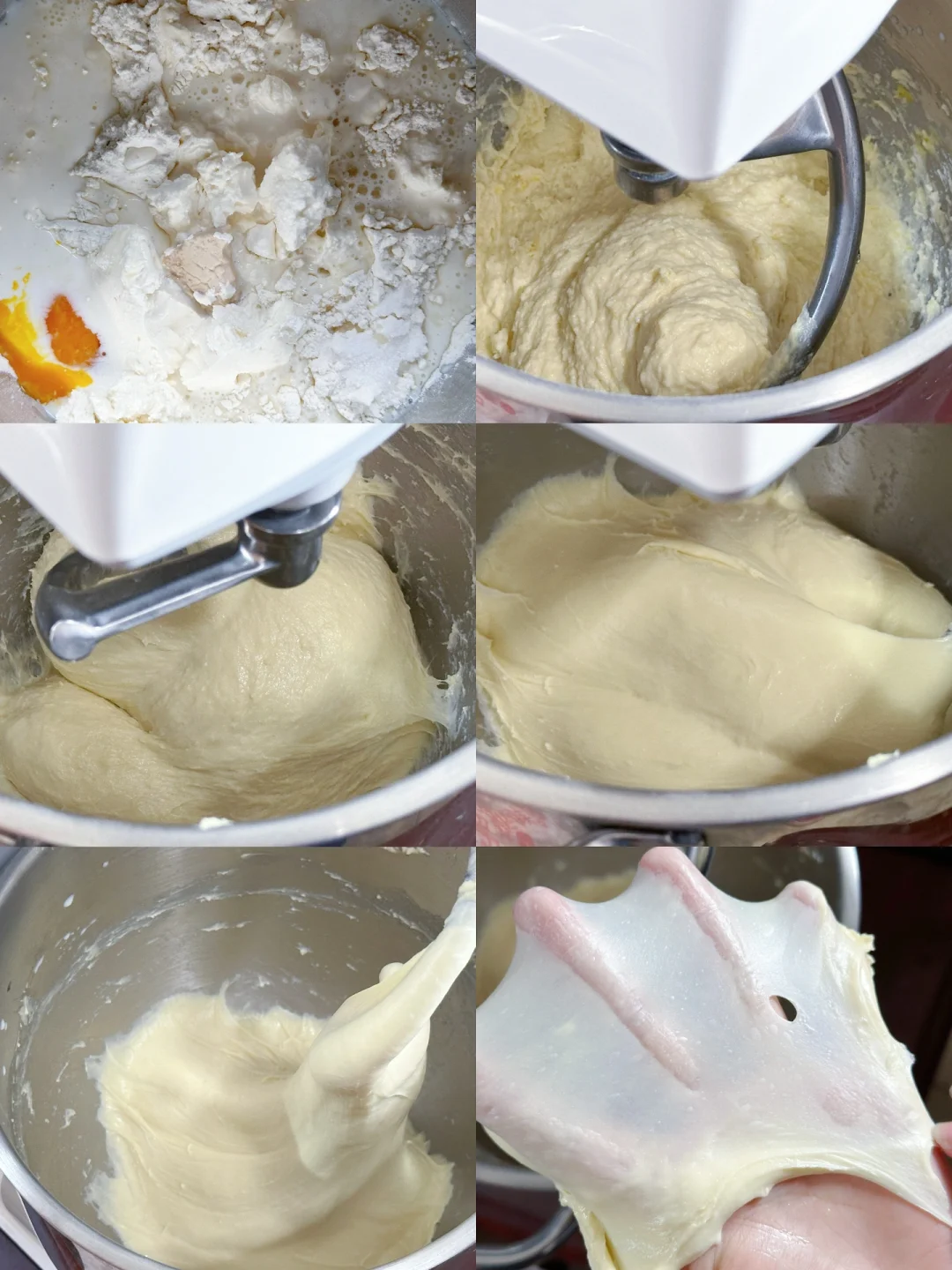 1️⃣除黄油以外的所有面团材料放入厨师机桶内厨师机1或2档搅拌至无干粉,切换至5~6档打面10分钟左右,能扯出厚膜,加入软化好的黄油开3档揉至黄油吸收,再切换至5-6档揉至完全拓展阶段,能扯出薄膜即可。