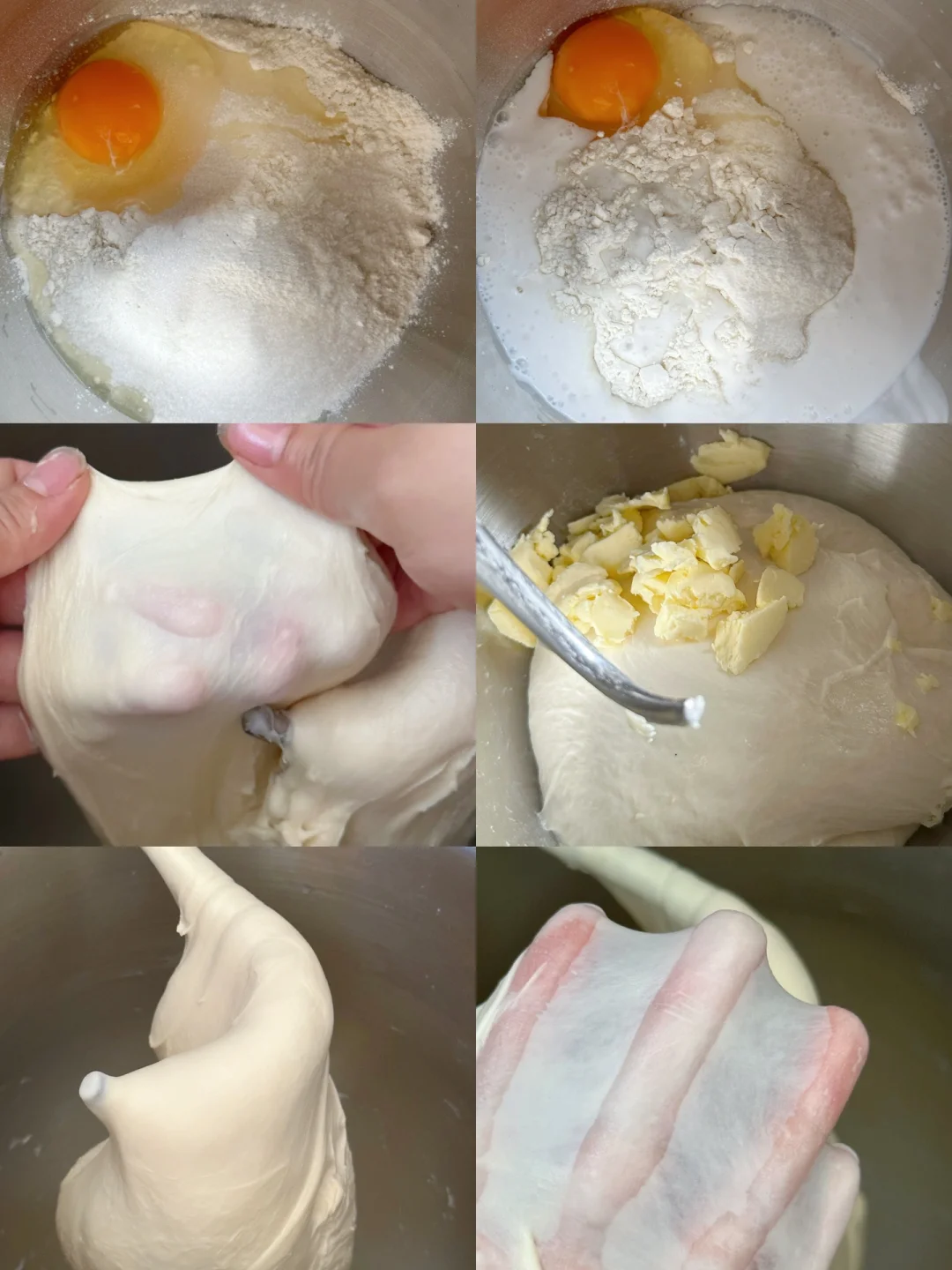 1️⃣除黄油以外的所有面团材料放入厨师机桶内厨师机1或2档搅拌至无干粉,切换至5~6档打面10分钟左右,能扯出厚膜,加入软化好的黄油开3档揉至黄油吸收,再切换至5-6档揉至完全拓展阶段,能扯出薄膜即可。