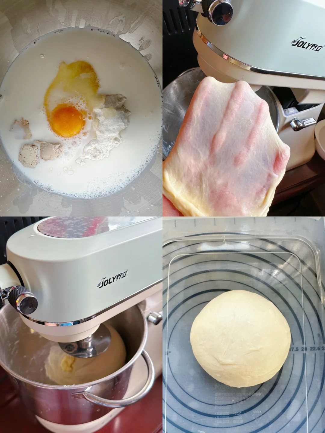 1️⃣除黄油以外的所有面团材料放入乔立L5c厨师机桶内,选择1或2档搅拌至无干粉,切换至4-5档打面,能扯出厚膜,加入软化好的黄油开2档揉至黄油吸收,再切换至4档揉至完全拓展阶段,能扯出薄膜即可。