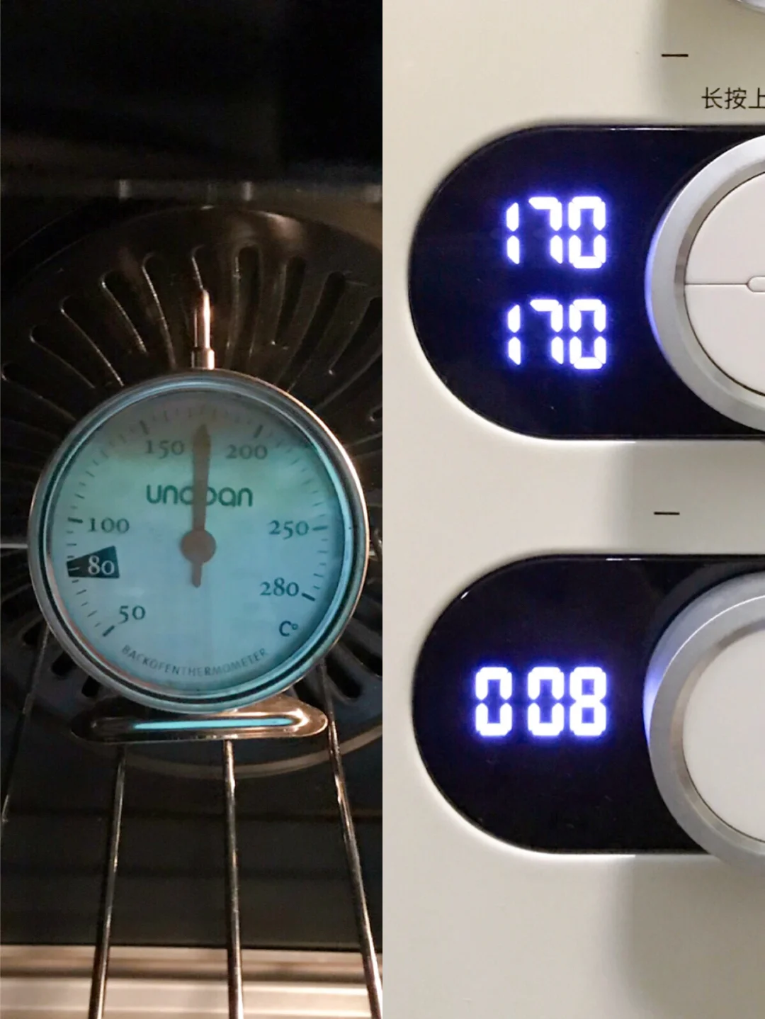 🔥🔥目前看来这款烤箱温度还是很不错的,我直接选择的内置饼干模式170度,大概四五分钟左右,温度计的温度就稳定在175度,只是相差了五度,很准了!