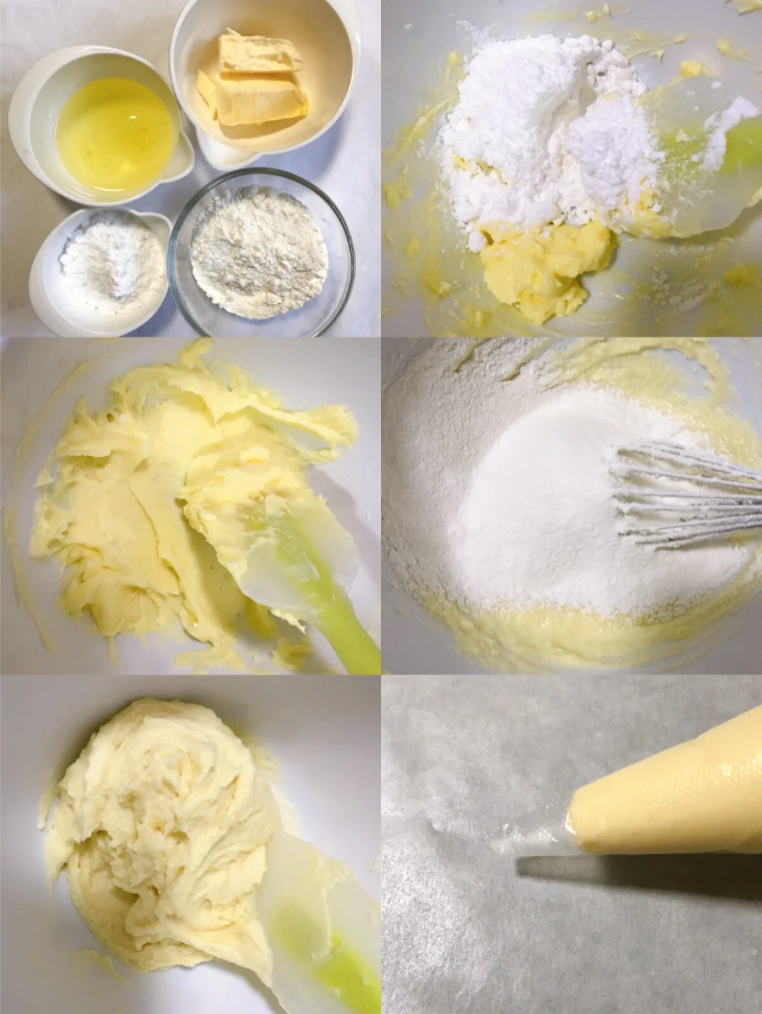 🌱黄油室温软化,加入糖粉混匀,少量多次加入蛋清,混匀,筛入低粉翻拌均匀,装入裱花袋。