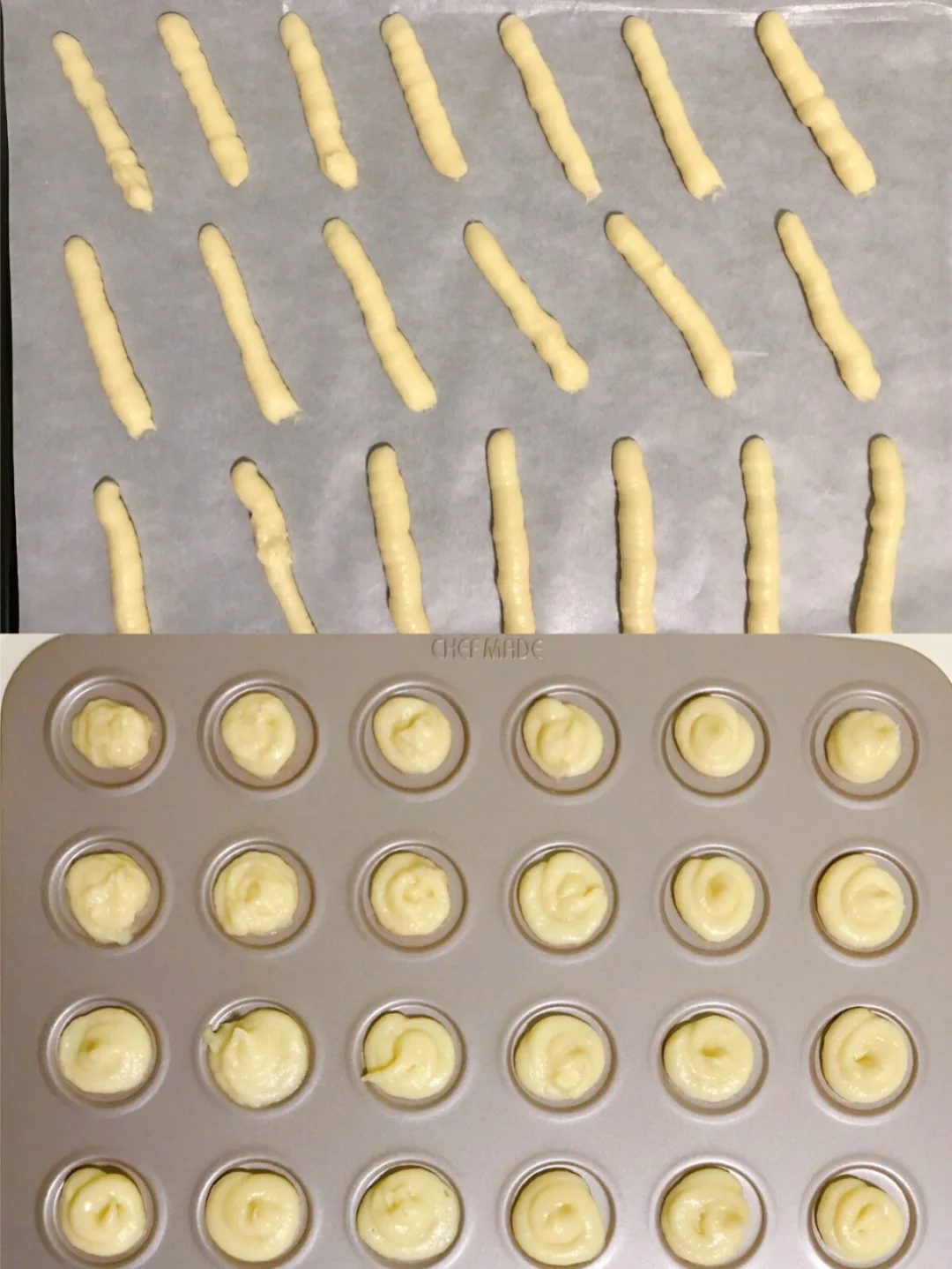 🌱我挤了两盘,长条盘的没眼看~稍微挤得好一点,人就飘了,结果越挤越难看!(因为天气比较冷,正好又是餐点,等吃了饭收拾好娃,再来挤的面糊~那个手叫一个痛……)如果像我一样久了才来挤,一定记得先放温水里稍微温一下,就不会手都废了也挤不出来整齐的条状!