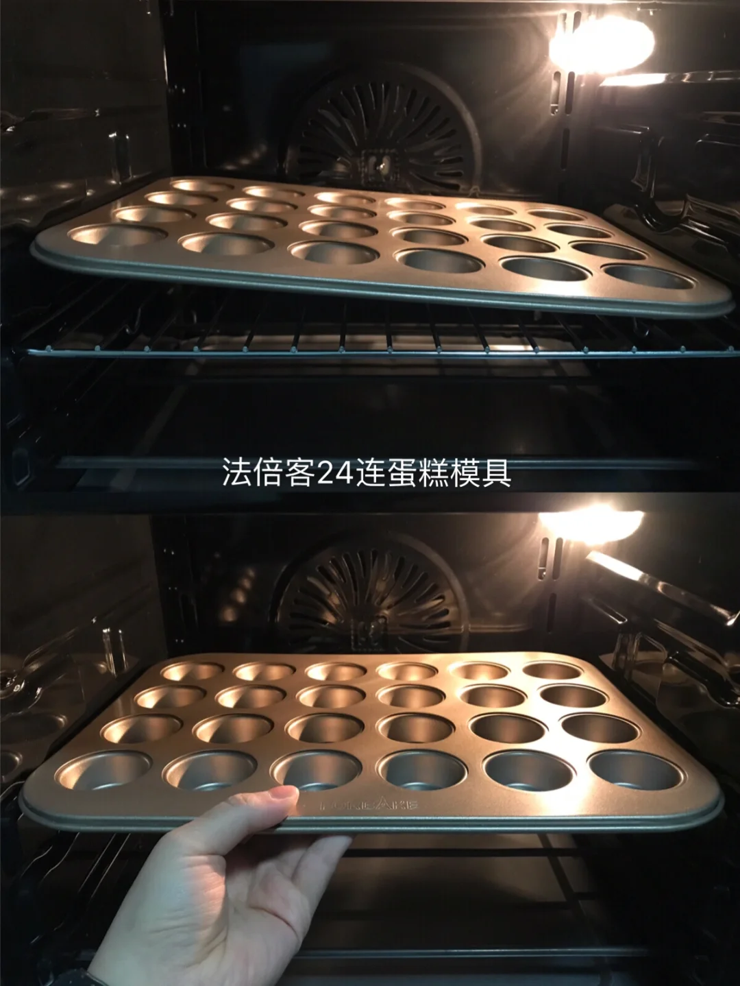 ✅法倍客24连蛋糕模具能从卡槽里放,但是短了一点点,不从卡槽里又长了一点点放不进去。在烤网或烤盘上放个东西垫一下还是可以用。(学厨20件蛋糕模具应该是可以放的)