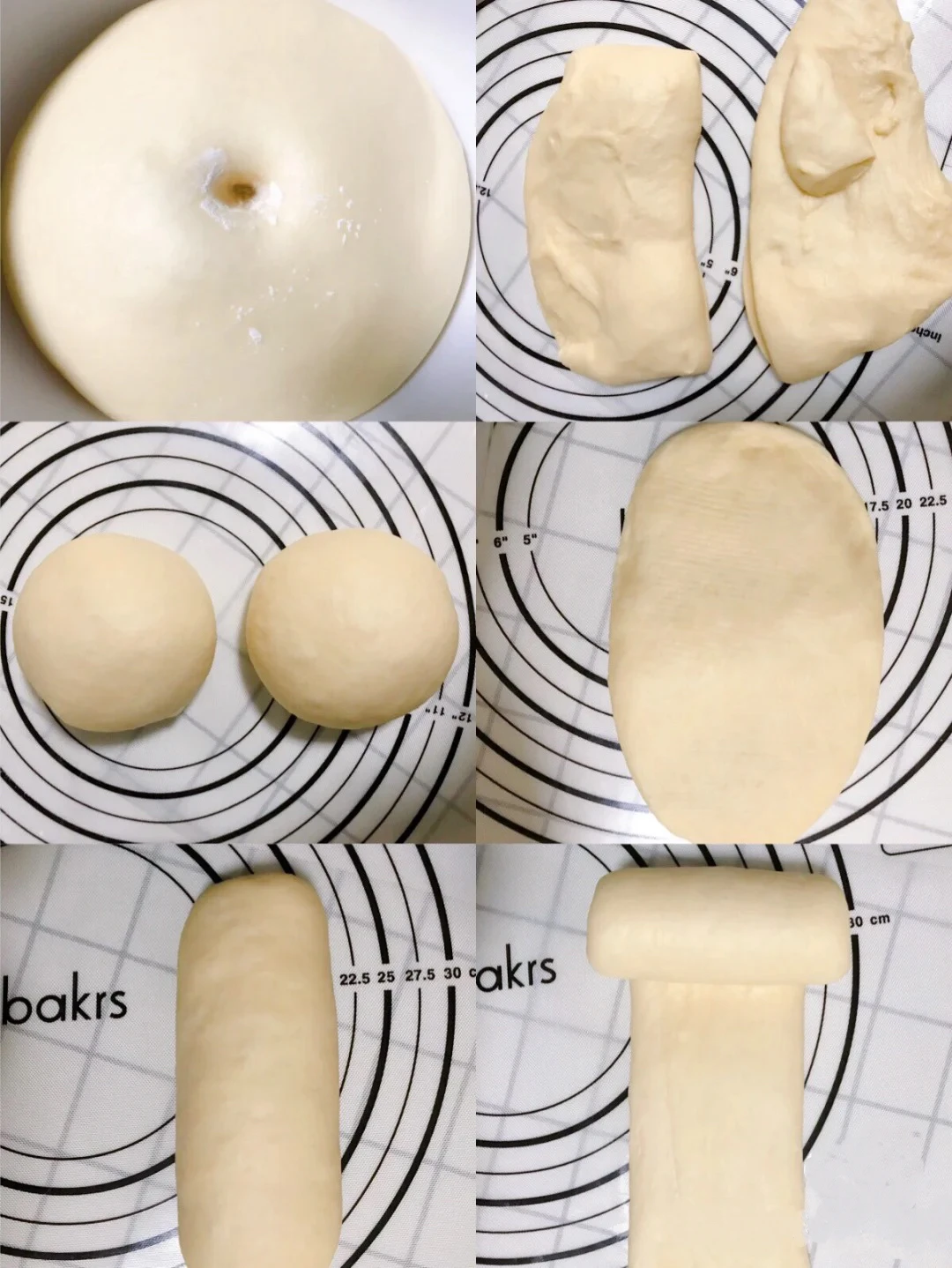 3️⃣取出发酵好的面团,轻揉排气,将面团分成大小均匀的六个面团,滚圆盖保鲜膜松弛20分钟。