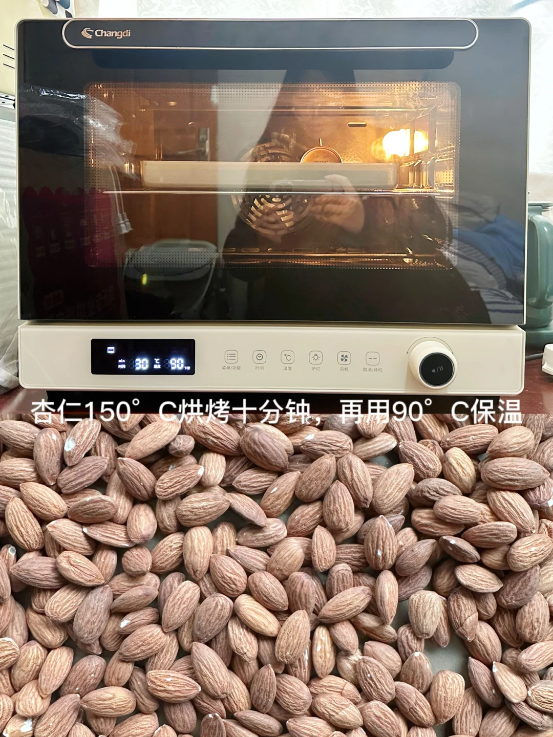 1️⃣杏仁先放入大白鲸风炉烤箱中150度烘烤十分钟左右,再用90度保温。