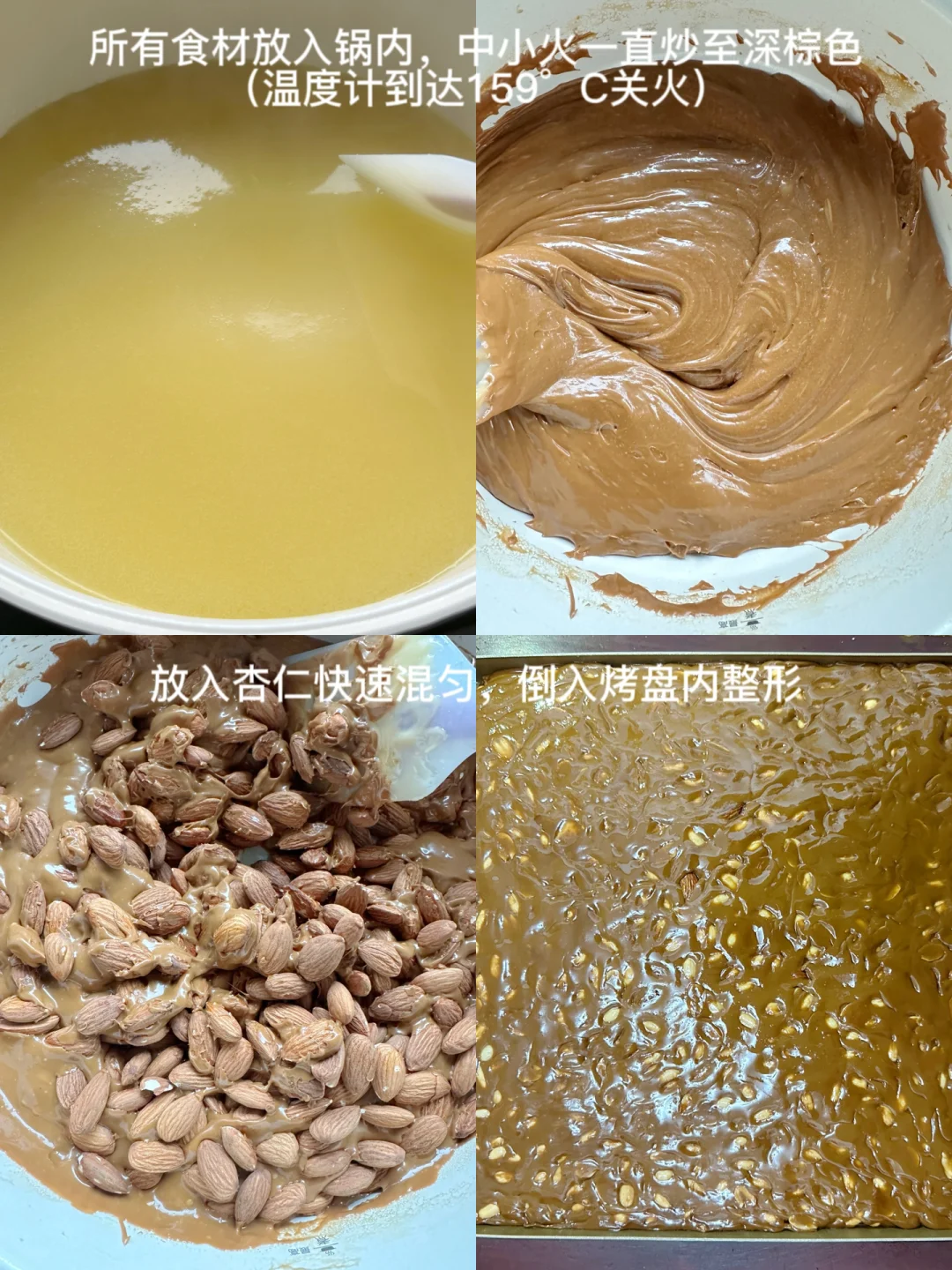 3️⃣趁热倒入杏仁翻拌均匀,再放入不粘烤盘中整型,晾至80度左右就可以开始切块。
