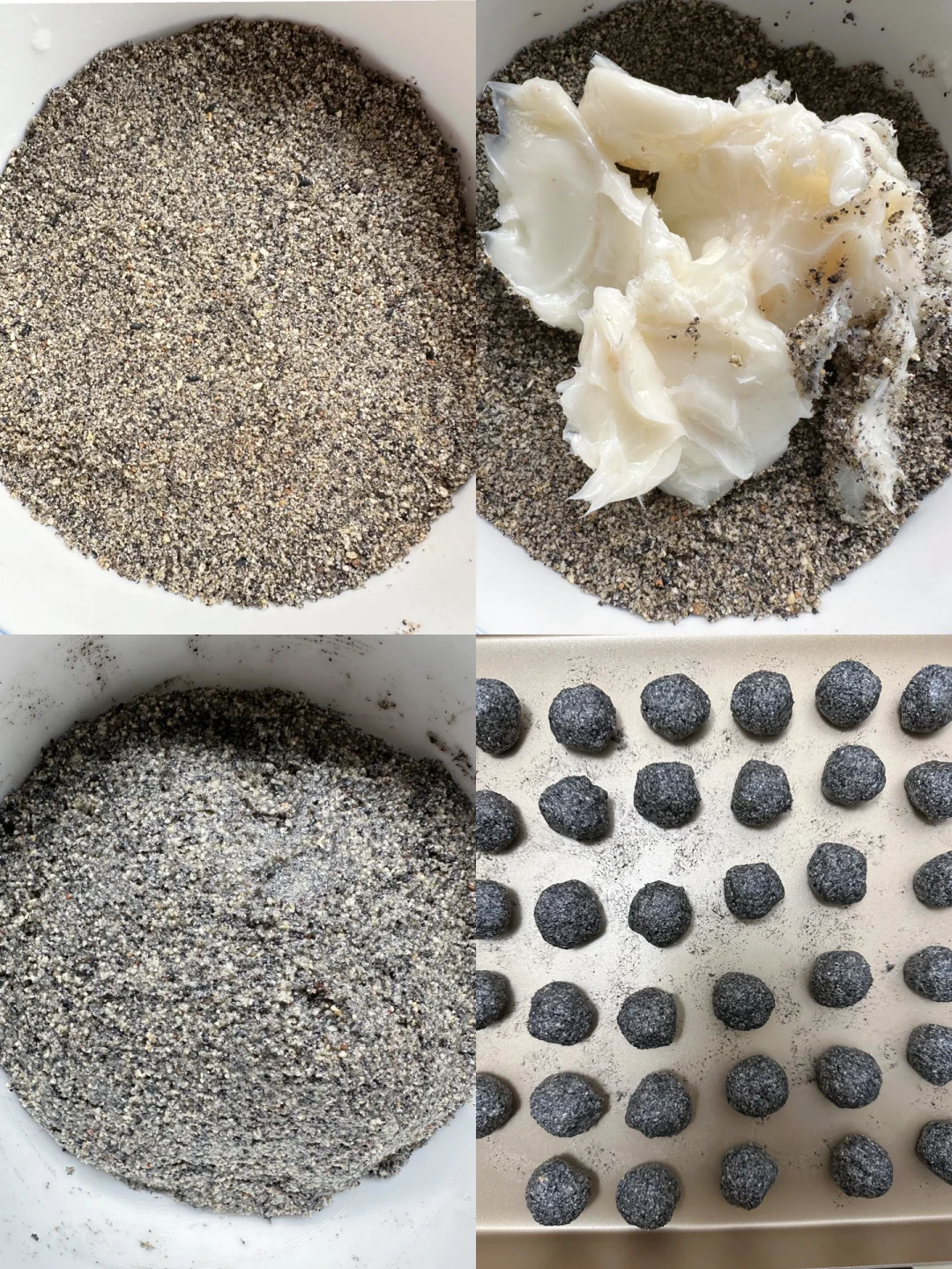 ☘️黑芝麻馅把黑芝麻,花生,白糖放入料理机打至细腻,加入猪油,分成小剂子搓圆放入冰箱冷冻半小时,花生馅将花生白糖放入料理机打至细腻,加入猪油和水怡混合均匀分成小剂子搓圆放入冰箱冷冻半小时