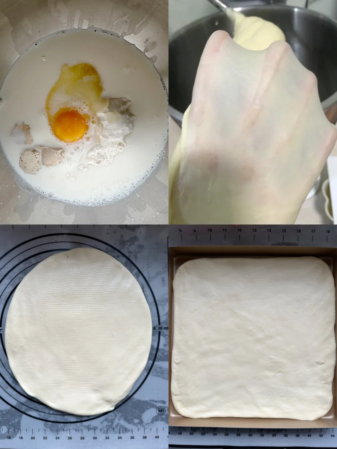 1️⃣除黄油以外的所有主面团材料放入厨师机桶内揉到面团光滑,能扯出厚膜,加入软化好的黄油揉至完全拓展阶段。
