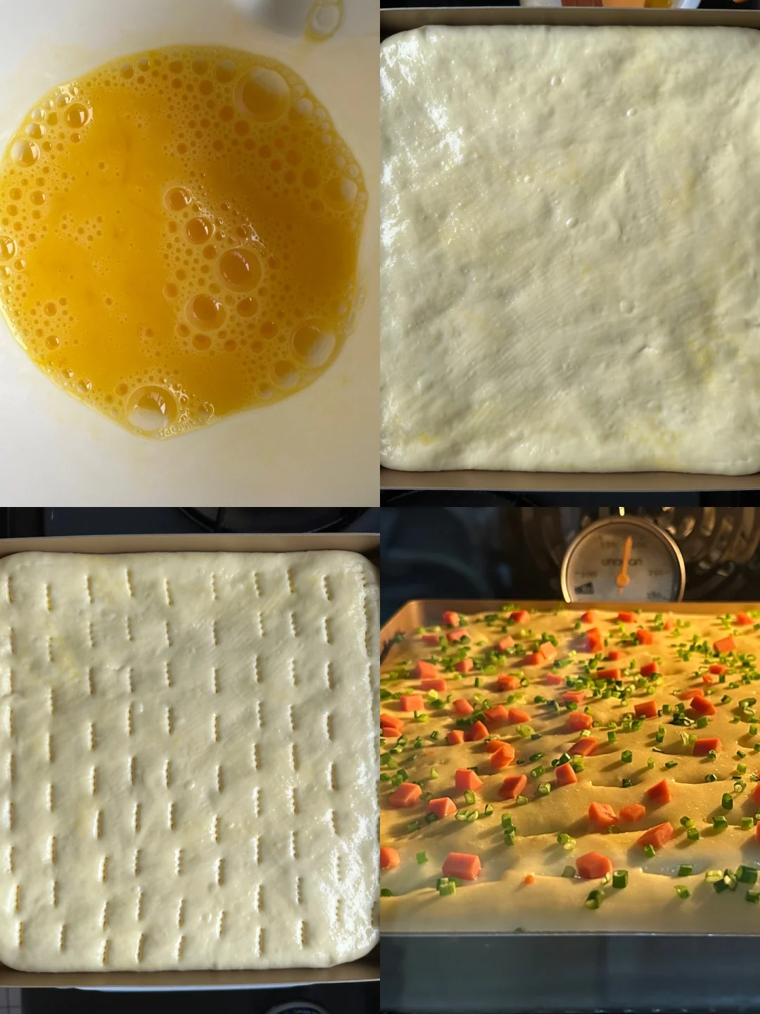 4️⃣将面团擀开,放入烤盘中,擀成均匀的面片,用叉子扎小孔,继续醒发至2倍大,刷蛋液,撒上葱花和火腿丁。