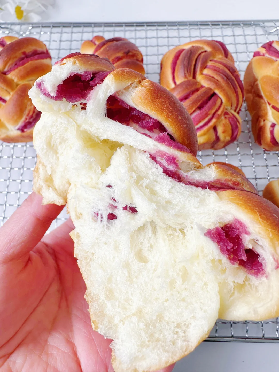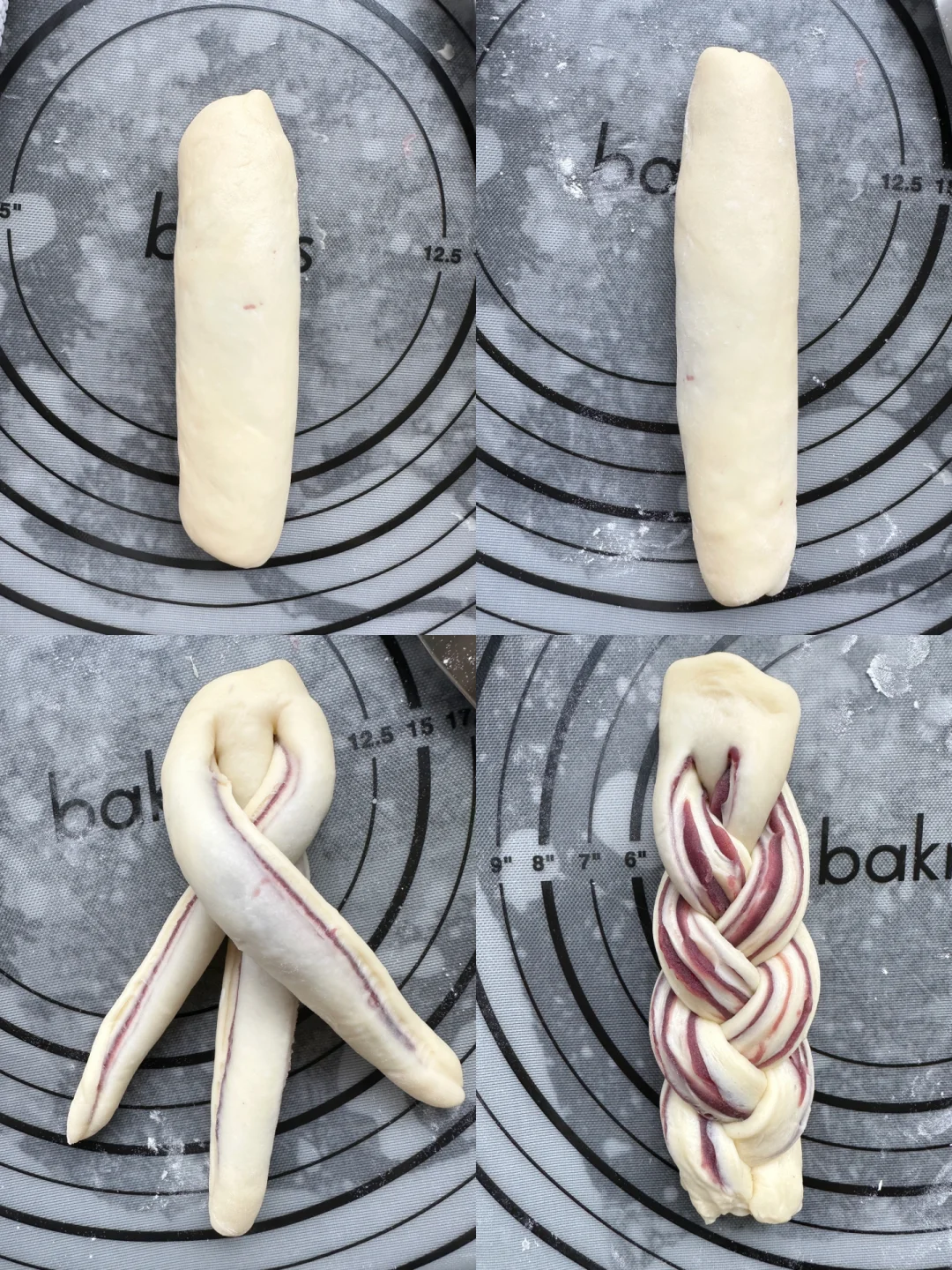 4️⃣ 取一个面团擀长,涂抹上紫薯陷,从上往下卷起,稍微搓长一点,再用刀切成3条,顶部不要切断,编3股辫,最后将面团两端往后折,放入模具。
