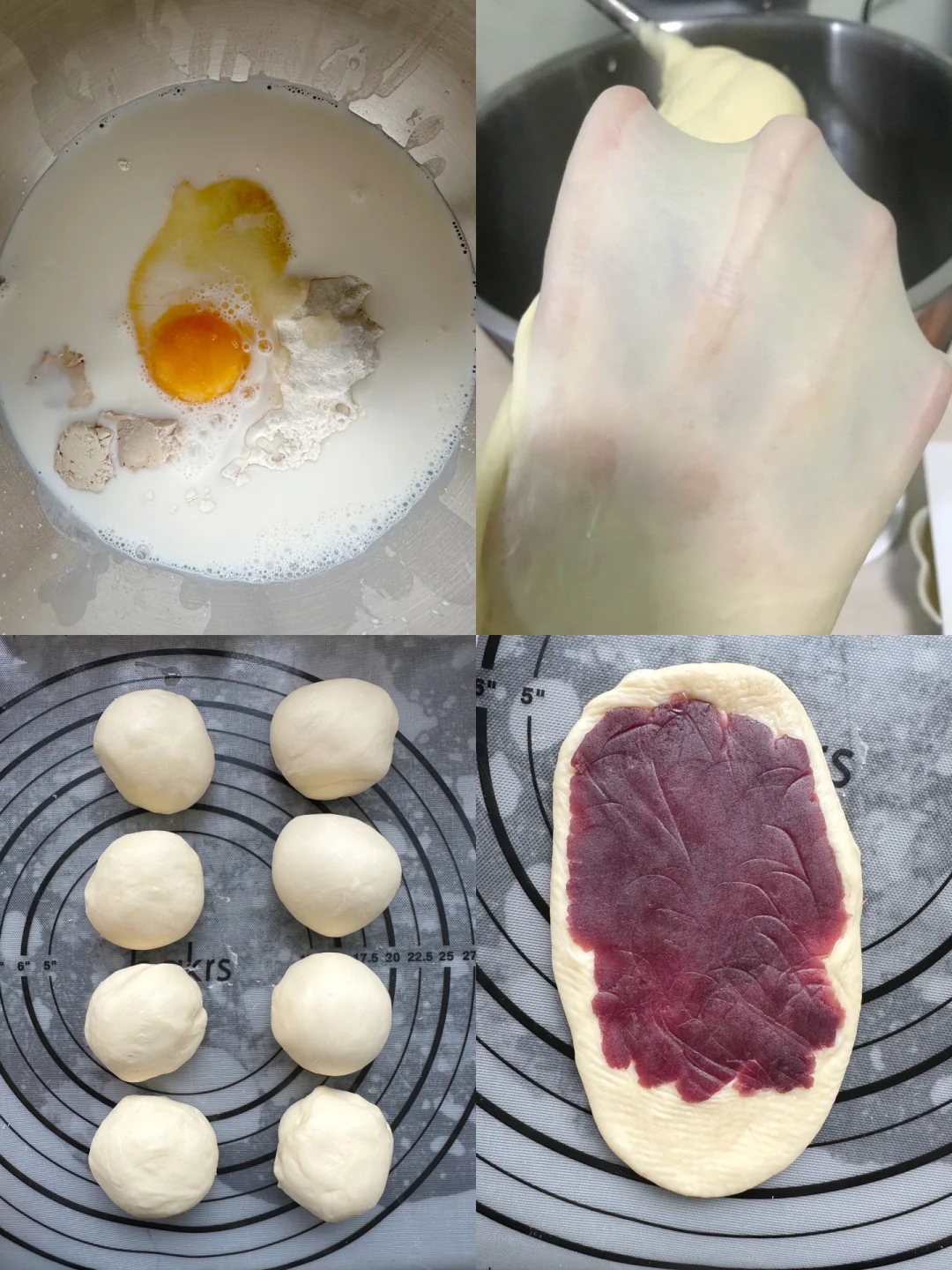 1️⃣除黄油以外的所有面团材料放入厨师机桶内揉到面团光滑,能扯出厚膜,加入软化好的黄油揉至完全拓展阶段。