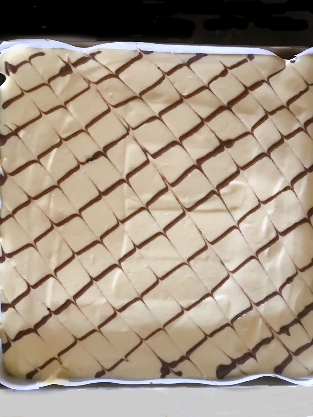 🌸混合好的蛋糕糊取一勺放入干净的碗中,筛入适量可可粉拌匀,装入裱花袋。烤盘中垫入油纸或油布,将混合好的剩余蛋糕糊倒入烤盘中,用刮板将蛋糕糊刮平。