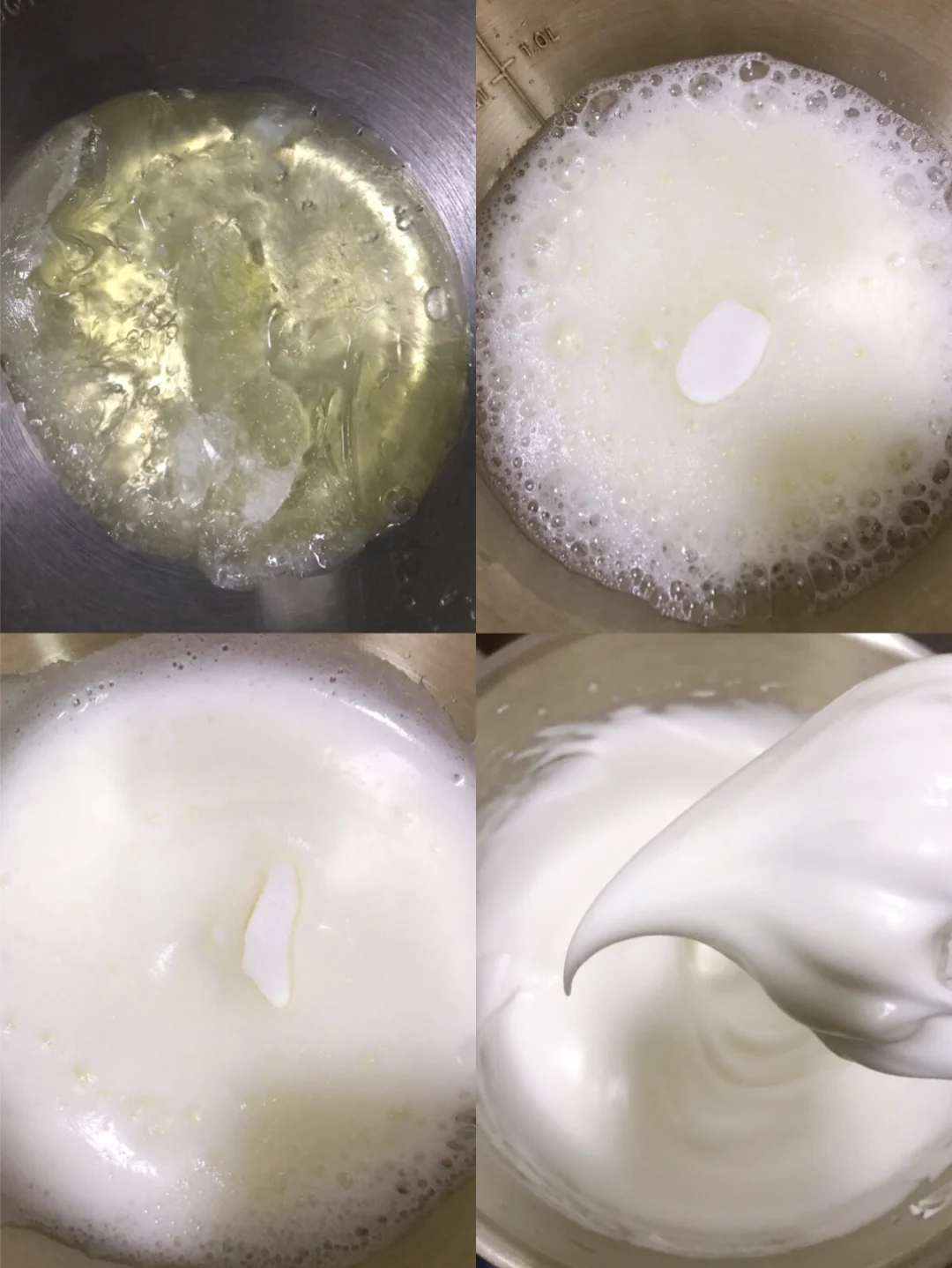 🌸蛋白中滴入几滴柠檬汁,分三次加入细砂糖,打发至提起打蛋头出现大弯勾(如图)。