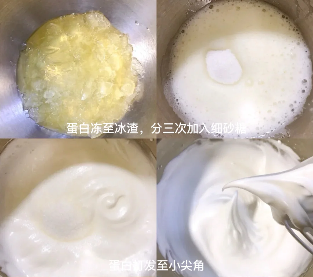 3️⃣蛋白中滴入几滴柠檬汁,分三次加入细砂糖,打发至提起打蛋头出现小弯角。