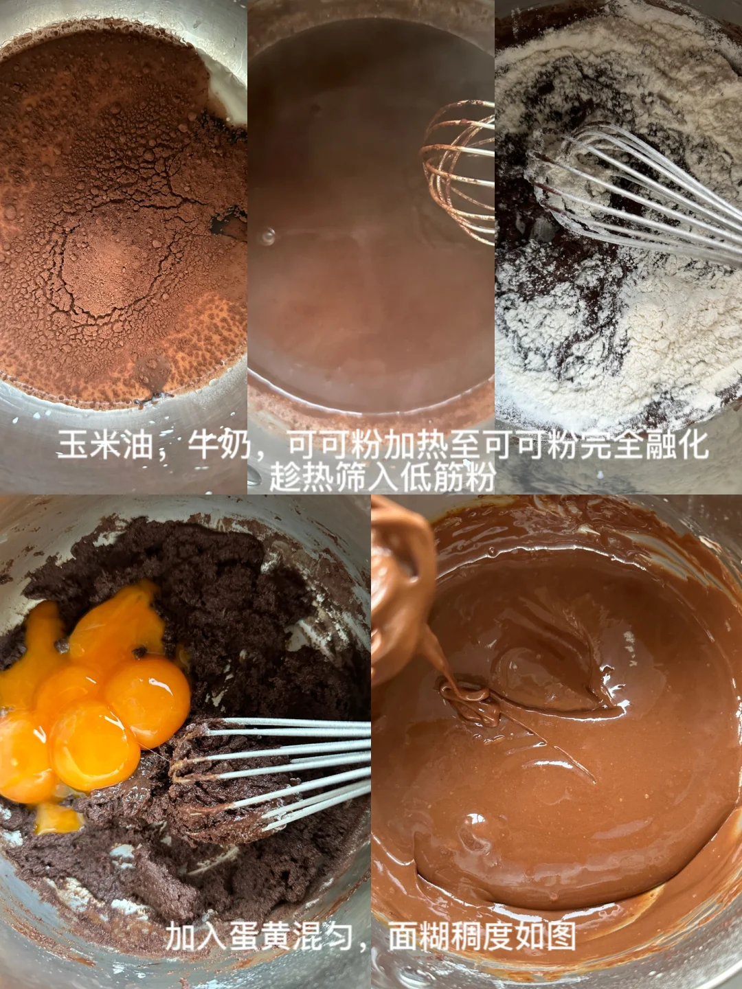2️⃣牛奶,玉米油倒入锅中小火加热,趁热加入可可粉搅拌均匀,加入巧克力使其融化,筛入低粉画一字(或Z字)混匀,加入蛋黄混合均匀,面糊稠度如图。