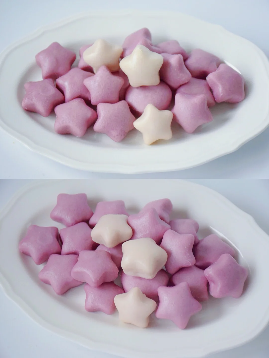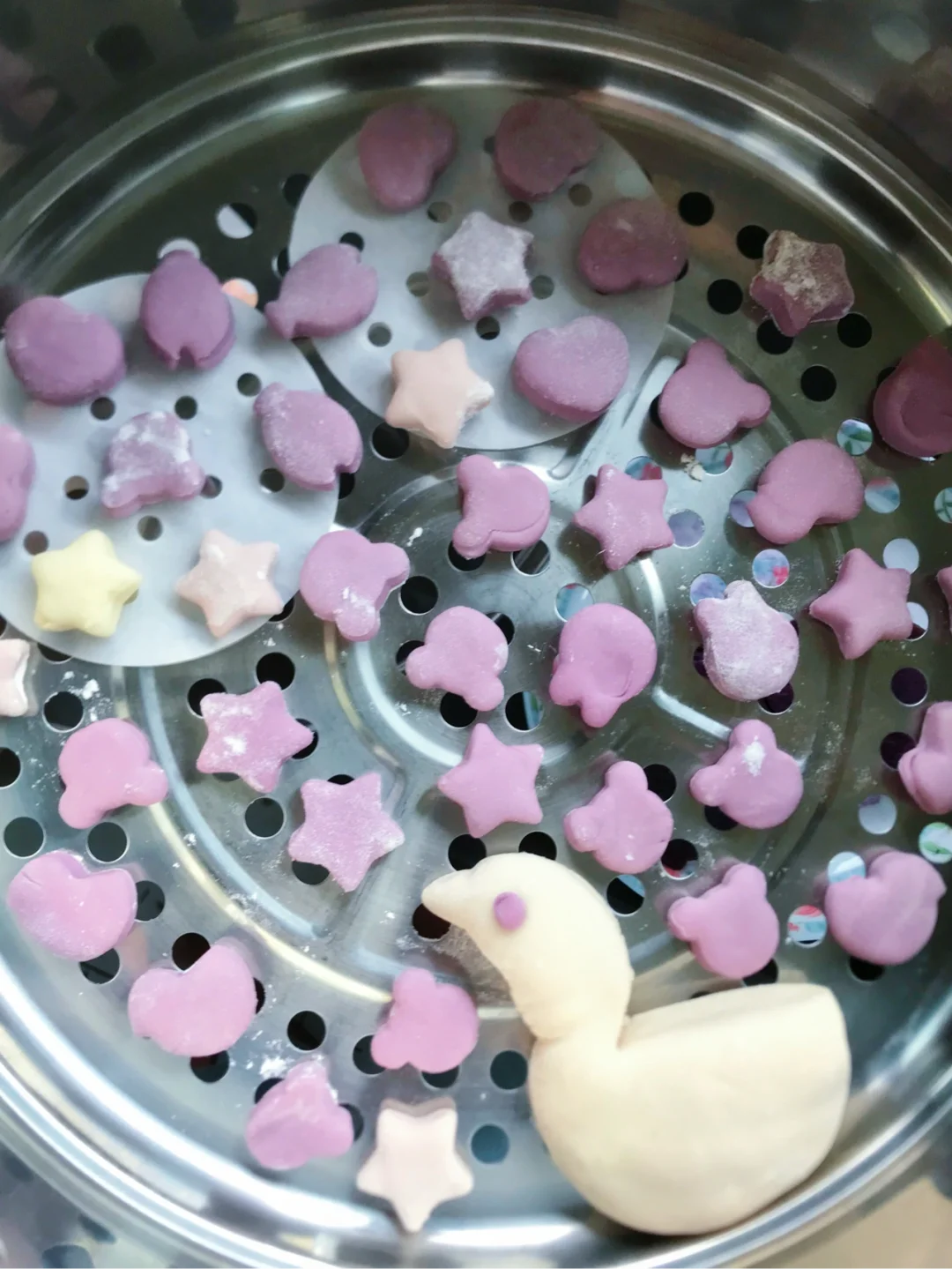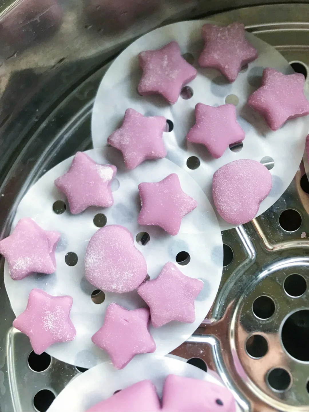 👉配方2:紫薯上锅蒸熟,取80g加入配方奶,用料理棒打成泥,再与其余食材全部混合,用手揉成光滑面团(也可直接用压面机压至表面光滑的面片),用擀面棒擀成面片,用模具压出花片,放锅里醒发至1.5倍大