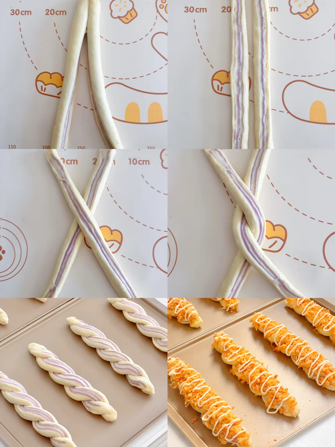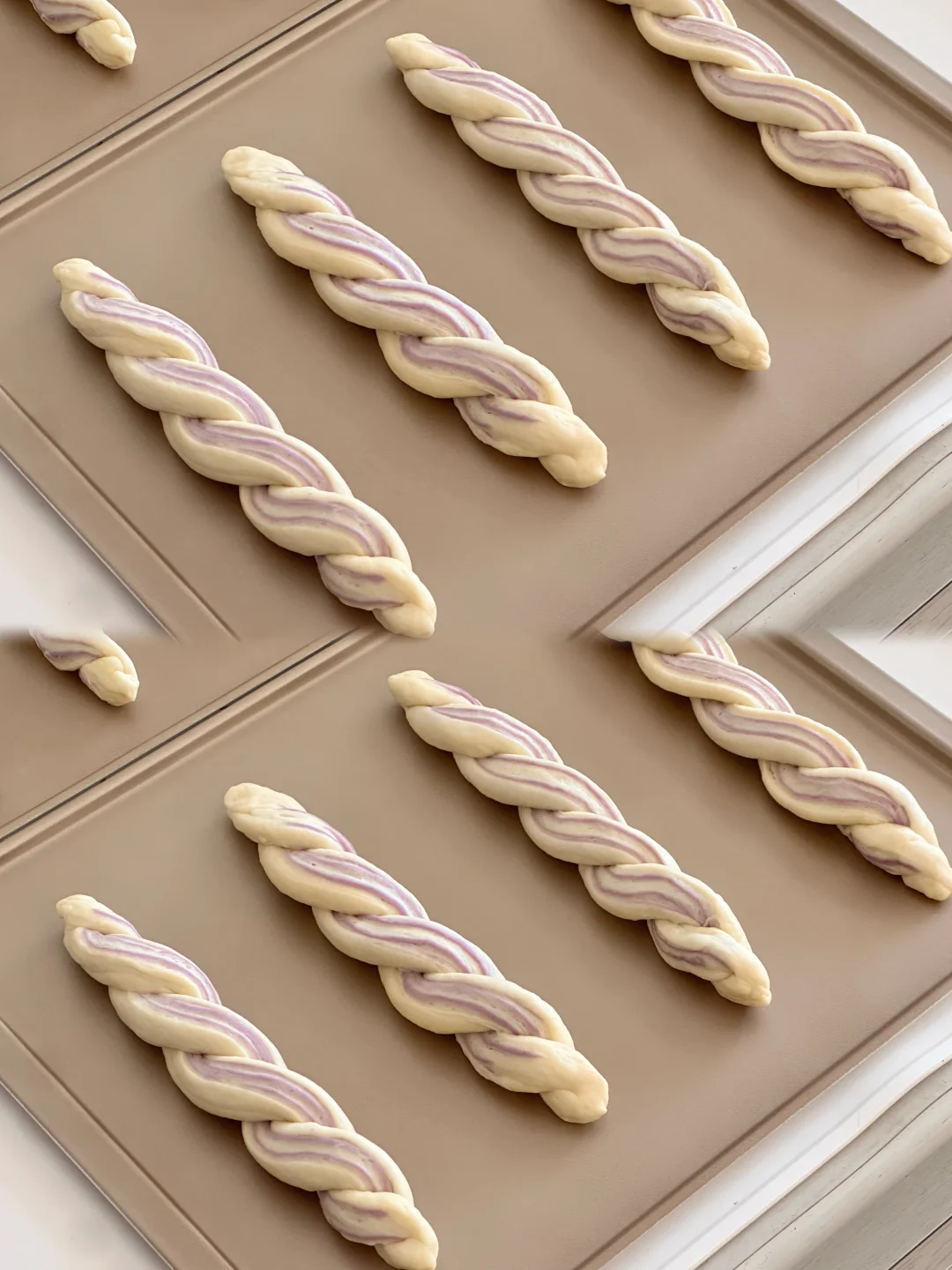 4️⃣稍微压扁,从中间切开,切口朝上,交叉拧成麻花辫,两端捏紧放入烤盘,全部做好后放入发酵箱温度35度湿度 80%二次发酵至两倍大。