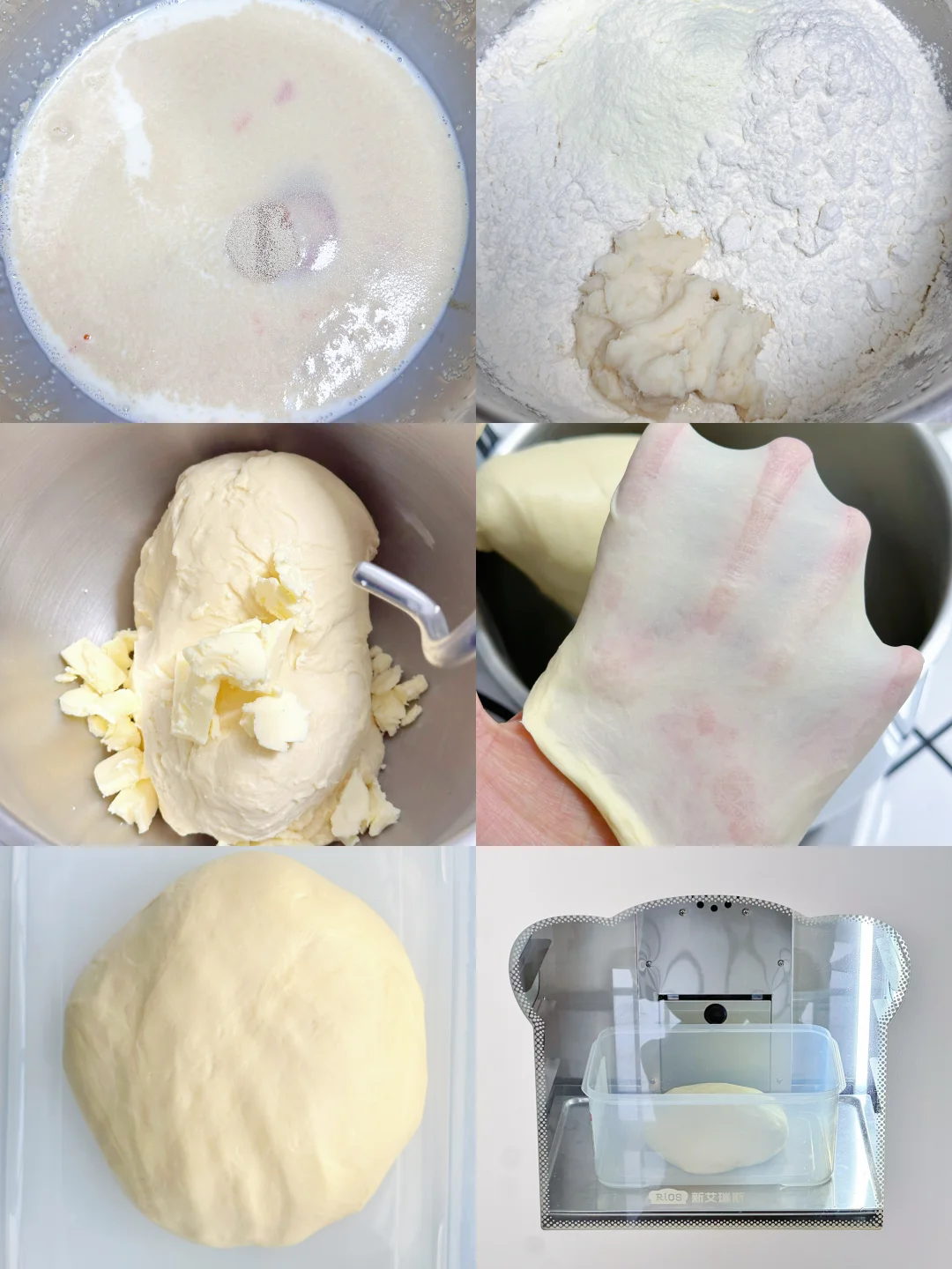 1️⃣除黄油以外的所有面团材料放入厨师机桶内揉成光滑的面团,加入黄油揉至完全拓展阶段。