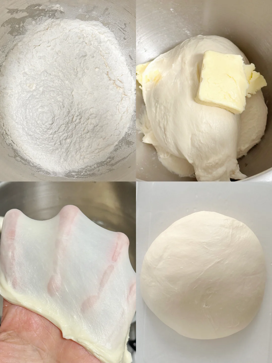 2️⃣除黄油以外的所有面团材料放入厨师机桶内,低速搅拌至无干粉,切换至中高速打至能扯出厚膜,加入软化好的黄油开低速揉至黄油吸收,再切换至高速揉至完全拓展阶段,能扯出薄膜即可。