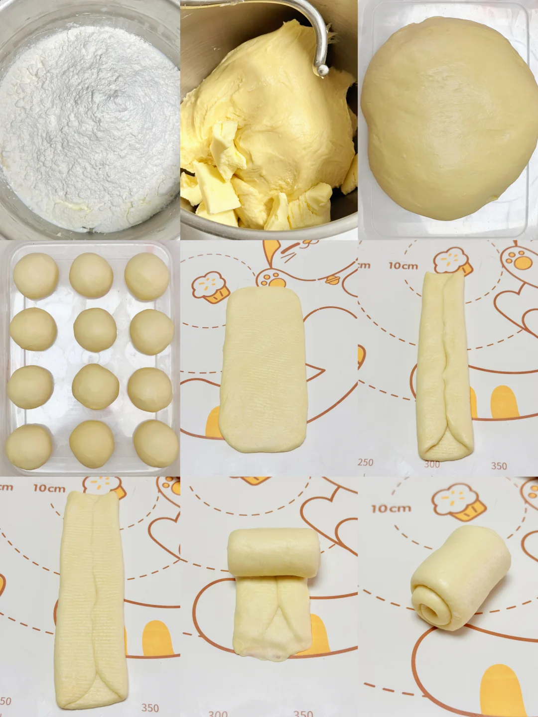 2⃣️揉出厚膜的时候加入黄油,低速揉至黄油吸收,再转高速打至能扯出手套膜(小餐包也可以不用出手套膜)