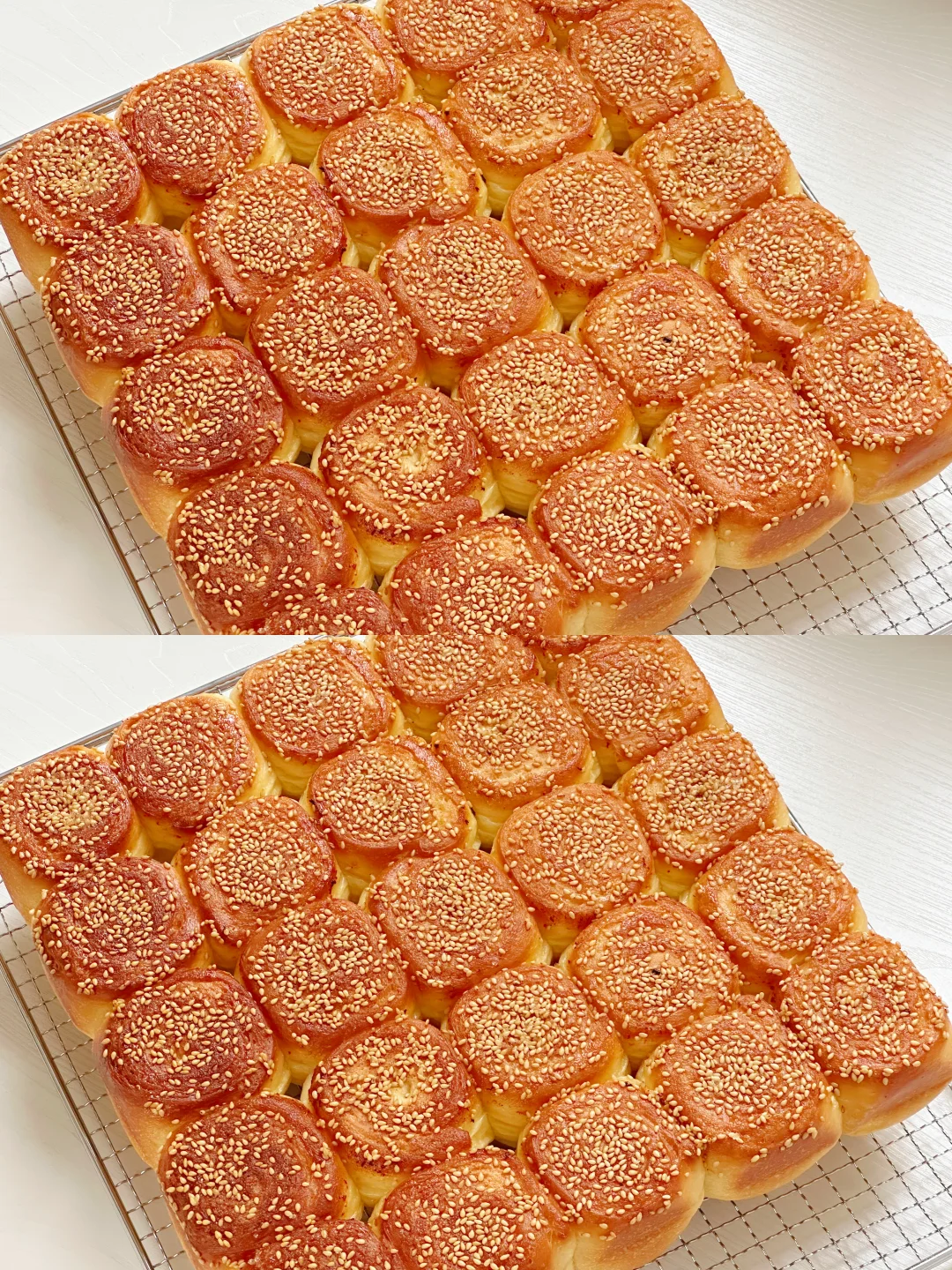 回来老家看见大街小巷都在卖这个小面包,又被孩子要求要做啦!真的是吃不腻呢~甜甜的、脆脆的底加上芝麻的香,内里面包体的柔软,真的百吃不厌啊!