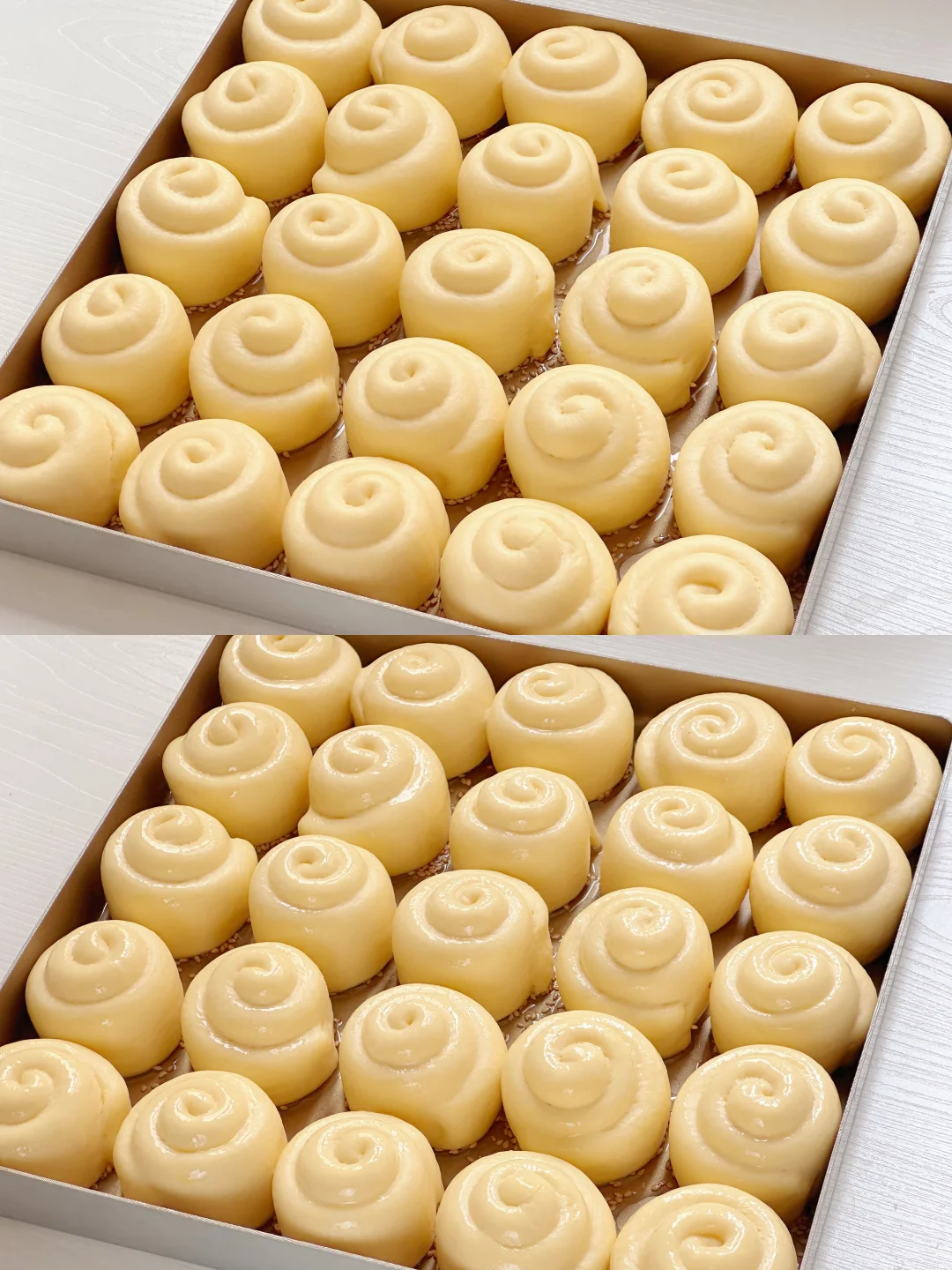 3⃣️揉好的面团盖保鲜膜放置28°C环境发酵至两倍大