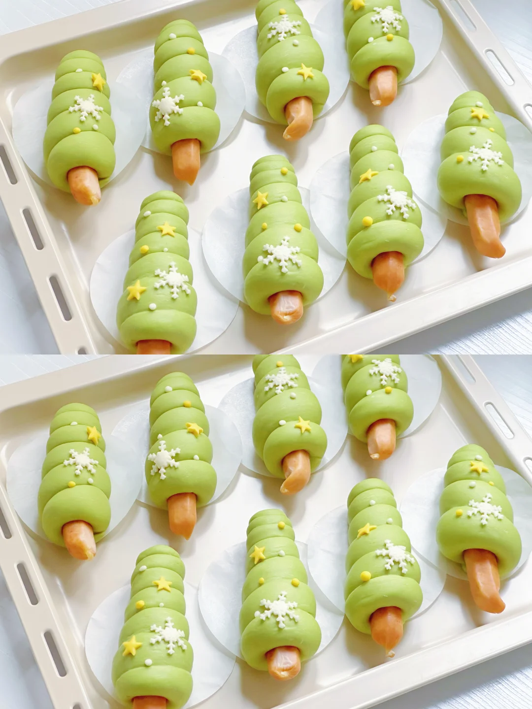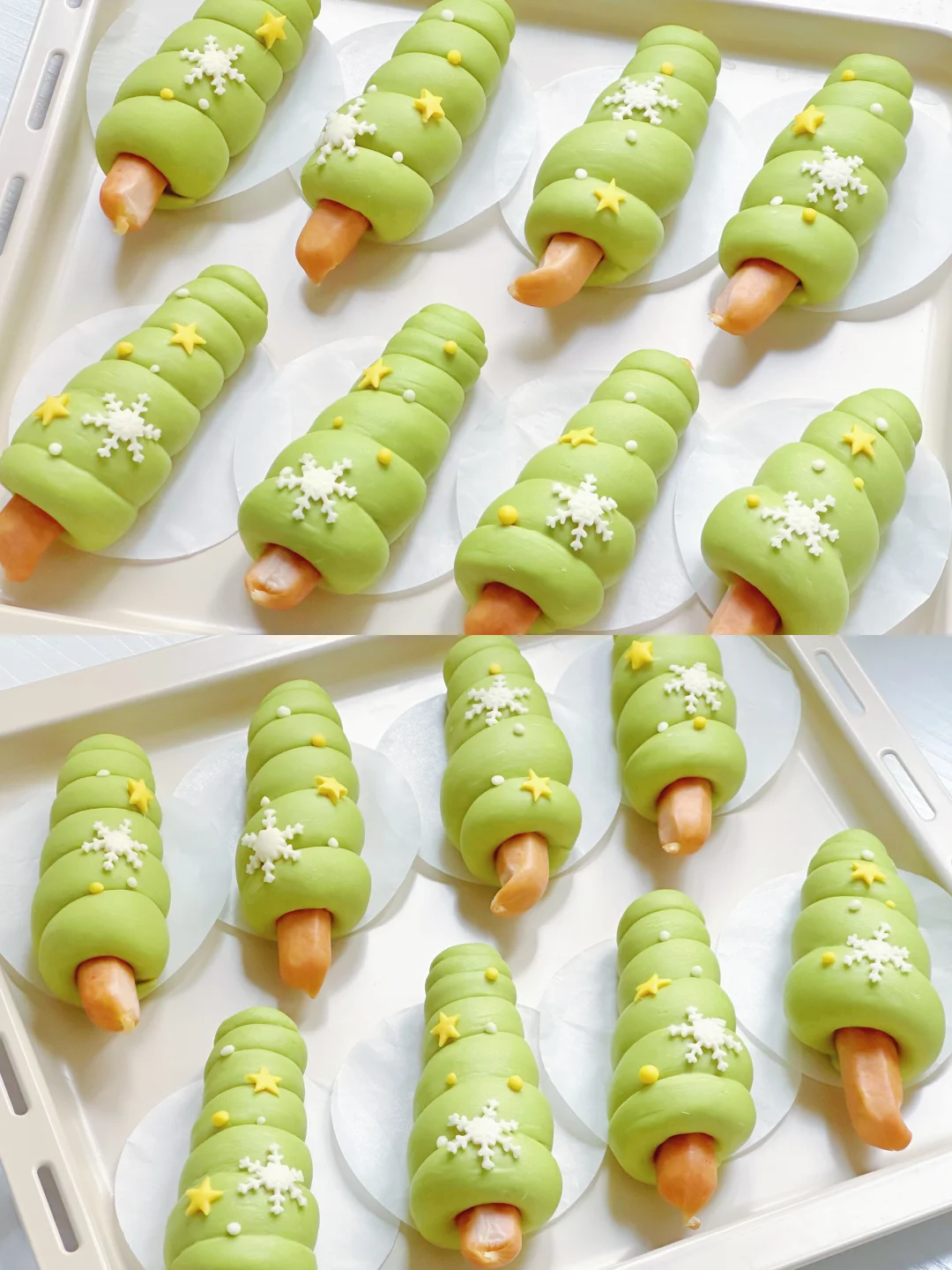 🔺白色面团和黄色面团分别擀成薄面片,用模具压出雪花、星星造型,贴在馒头胚表面。没有模具的也可以自行装饰。