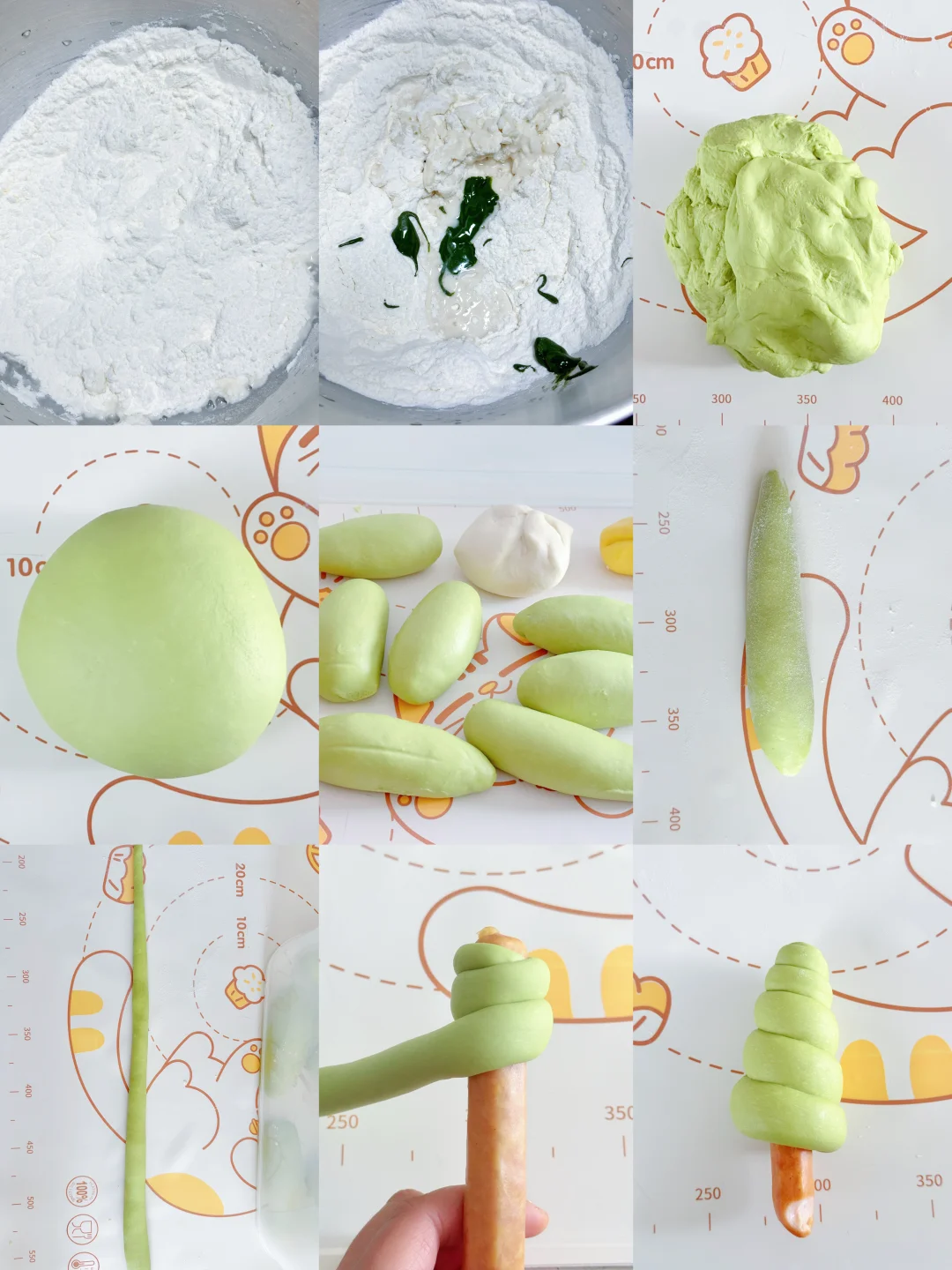 🔺将绿色面团分成大小均匀的8个剂子,搓成一端细一端粗的长条,从香肠一端开始卷起来。
