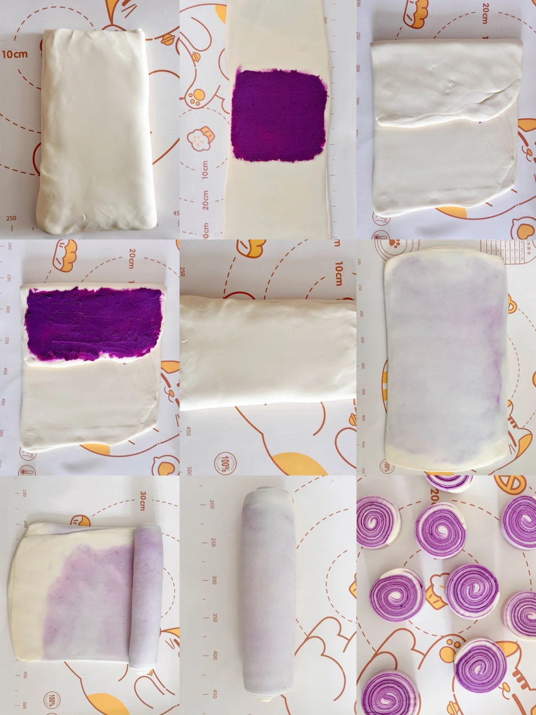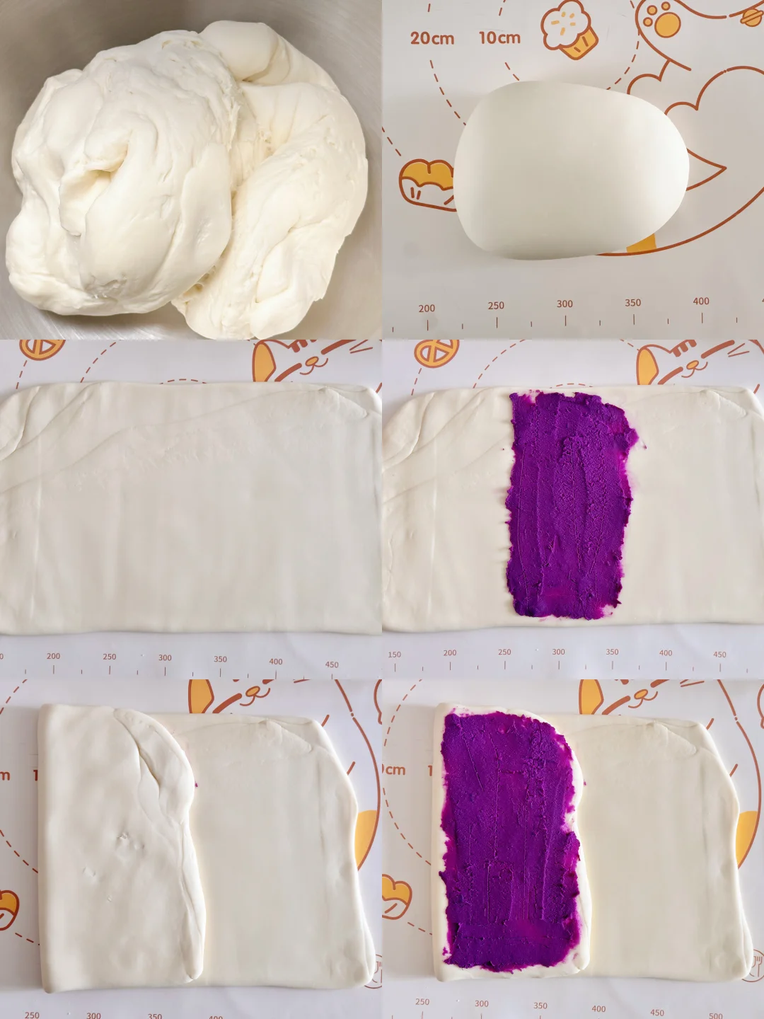 2️⃣用擀面杖或压面机,将面团擀成面片,在三分之一处放上紫薯馅,然后向中间折叠,再在折叠过来的面片上抹上一层紫薯馅,再将剩余三分之一的面片盖过来,将边缘捏紧。用擀面杖擀成长方形,再重复一次前面步骤。