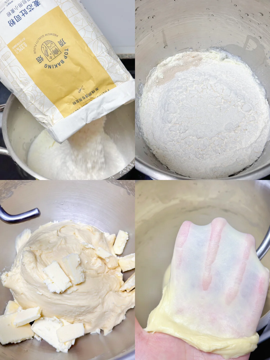1️⃣除黄油以外的所有面团材料放入厨师机桶内揉到面团光滑,能扯出厚膜,加入软化好的黄油揉至完全拓展阶段。