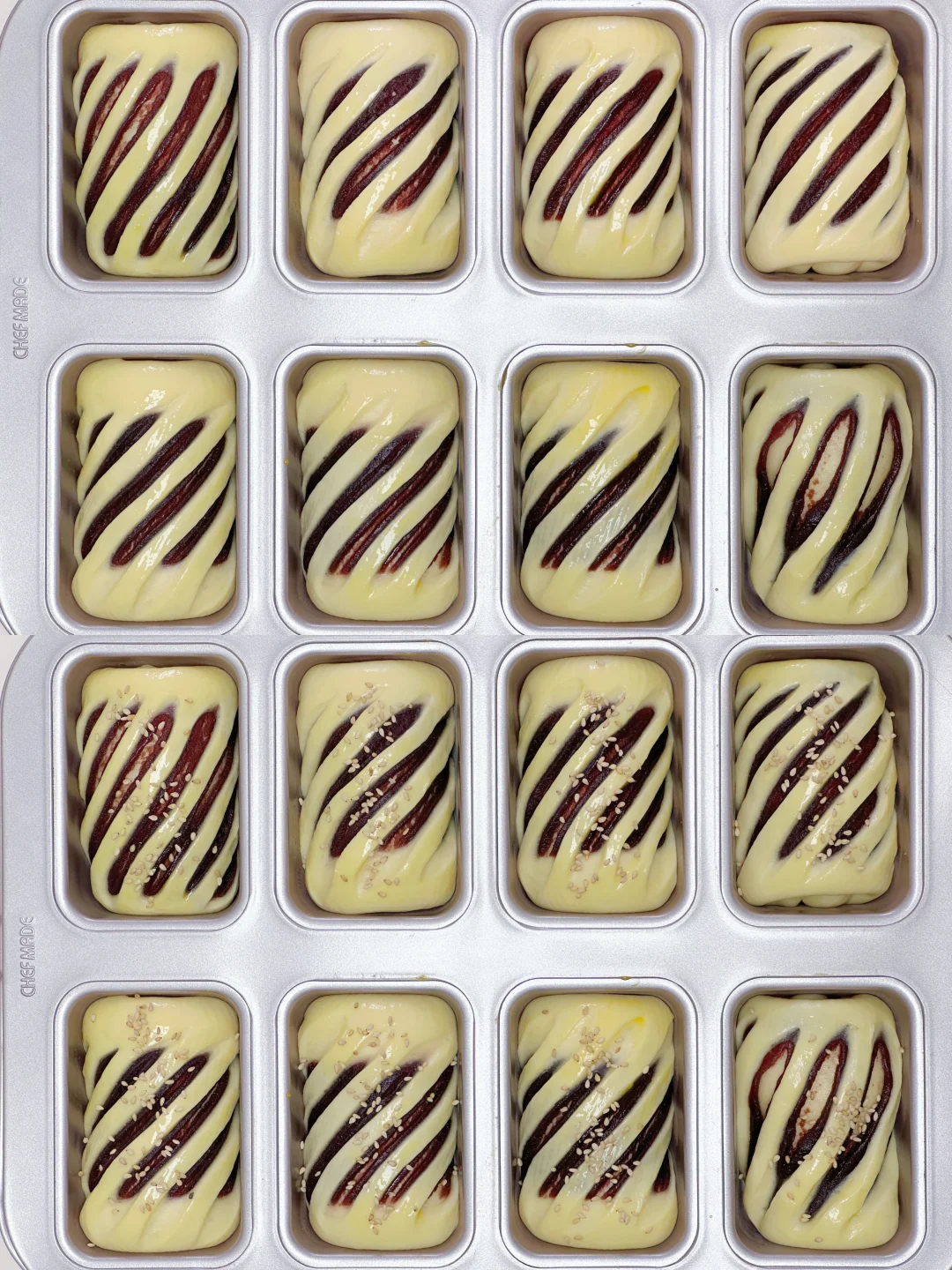 4️⃣全部做好后放入发酵箱32度,湿度75度左右发酵至两倍大。表面刷上蛋液,撒上少许芝麻。