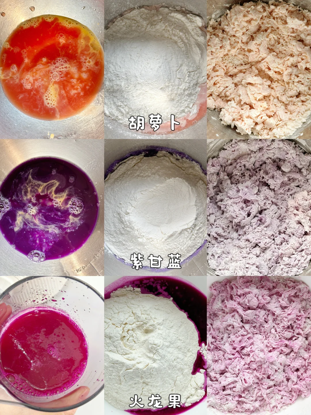 果蔬汁每个人做出来的含水量都不同,打成泥的时候水量加得多,和面絮的时候就记得预留部分果蔬汁,基本上面粉和果蔬汁用筷子成图片那样的絮状就差不多。