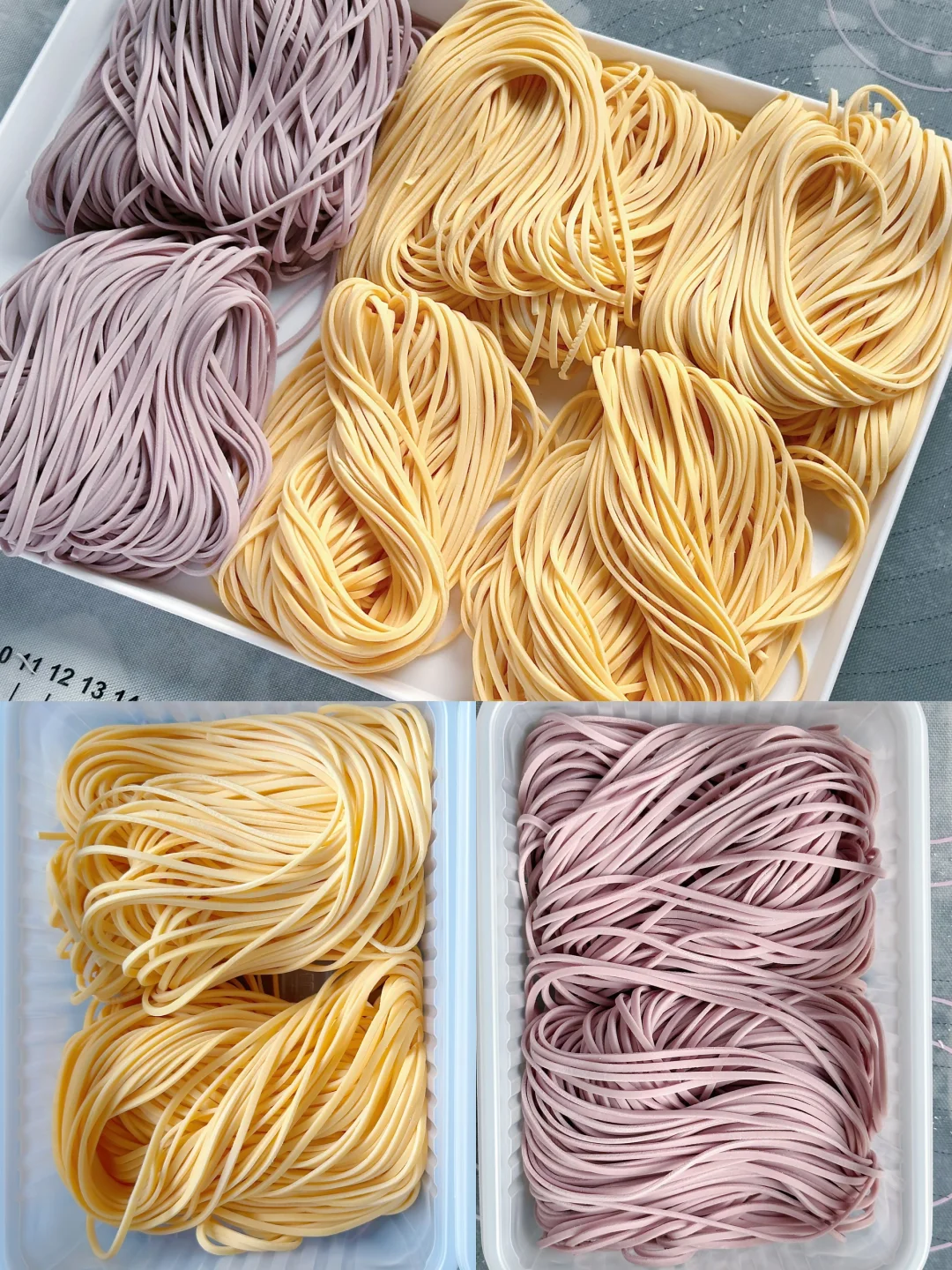 🟣紫甘蓝鸡蛋面条:中筋面粉280g,紫甘蓝汁90g,鸡蛋25g