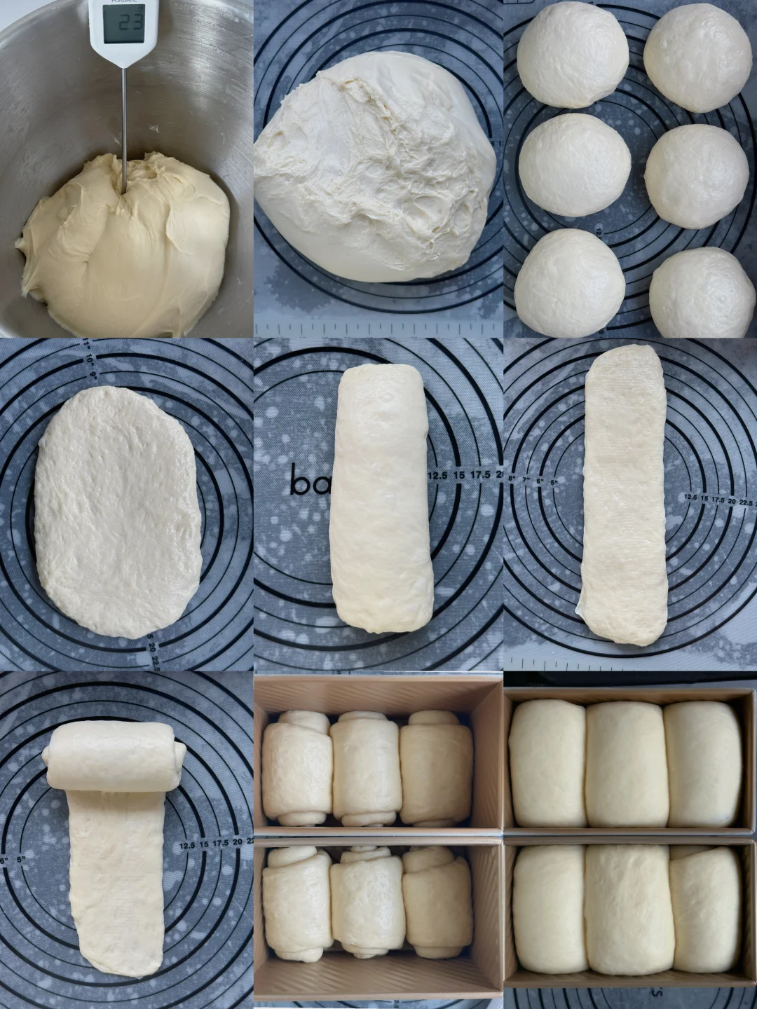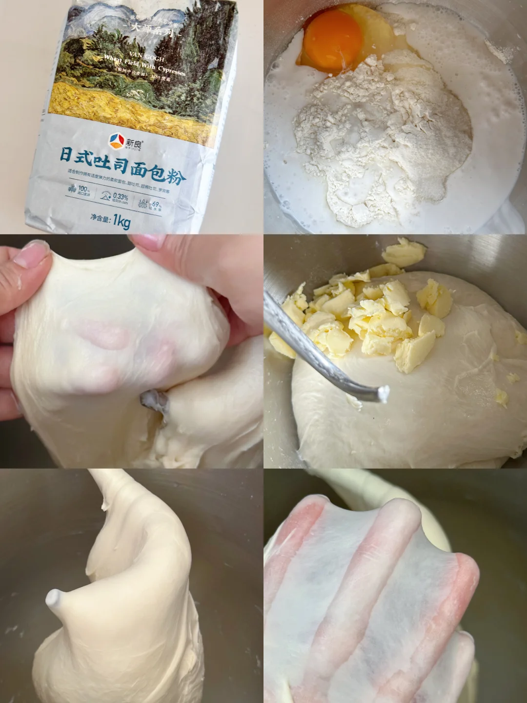 新良大师日式吐司粉500g,牛奶390g,鸡蛋25g,糖35g,海盐10g,半干酵母5g,黄油50g