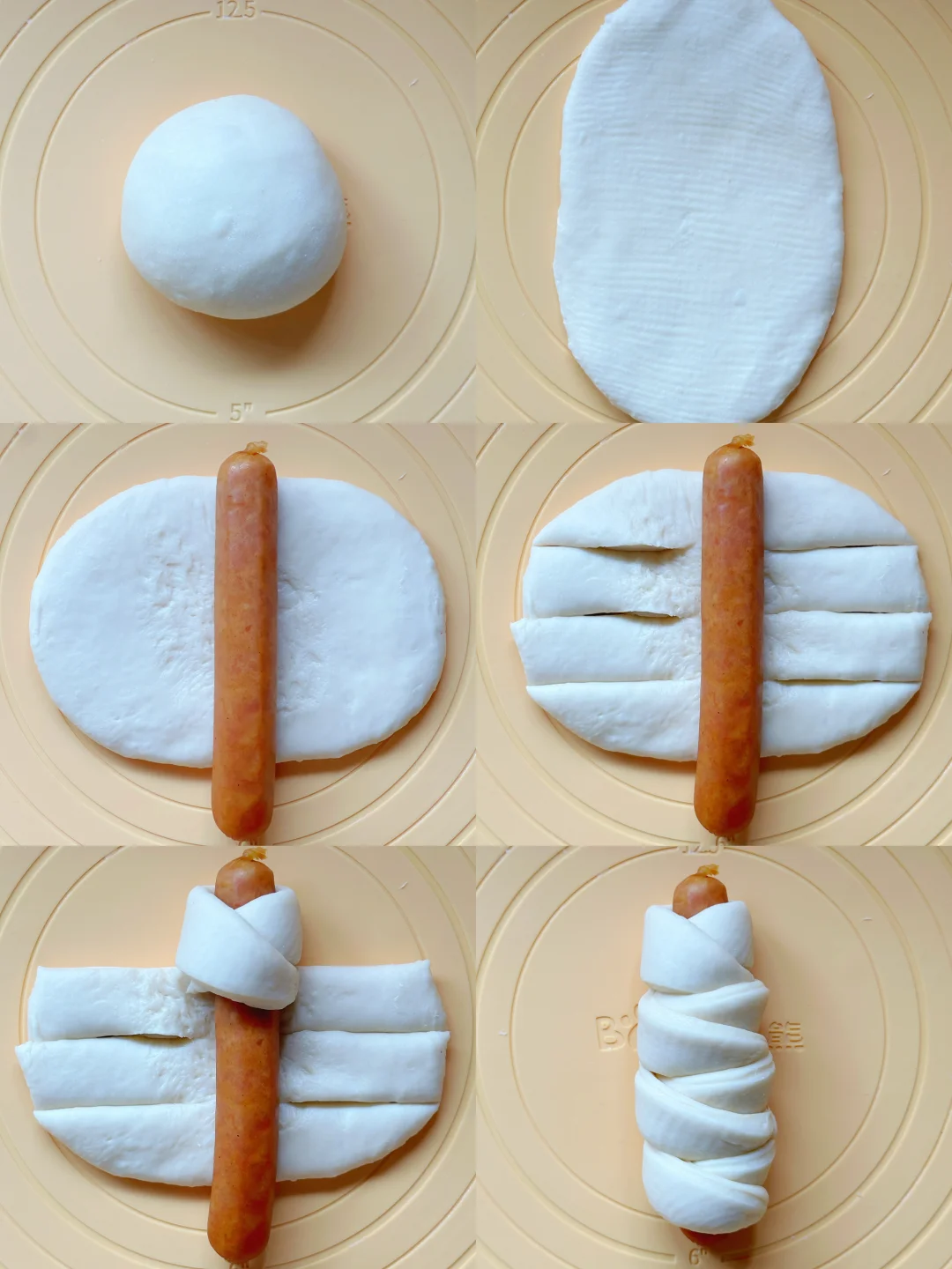 4️⃣取一个面团,擀开,翻面,中间放上一根烤肠,两边切4刀,如图裹好,最后收口处要捏紧。