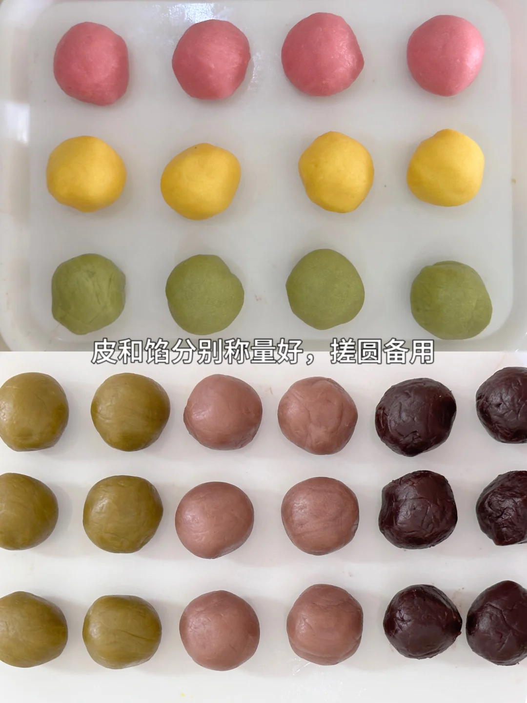 1️⃣冰皮粉200g+沸水160g搅拌均匀,用手揉拉直面团均匀无颗粒,分成25g/个备用。馅料也是均分成25g/个备用。