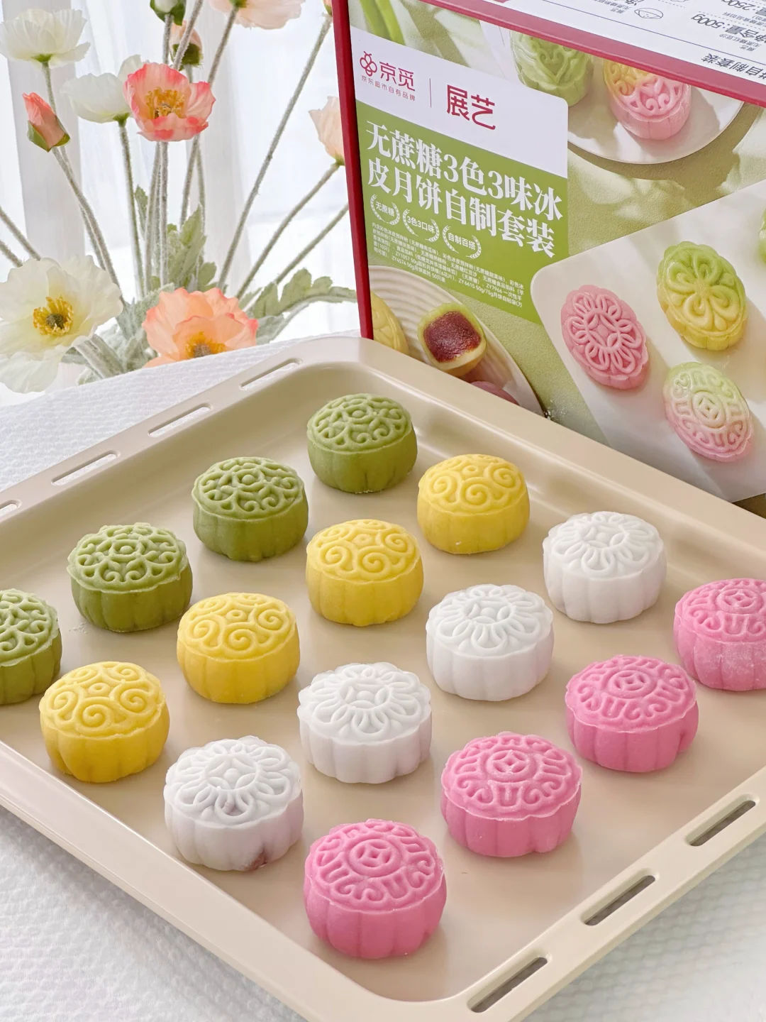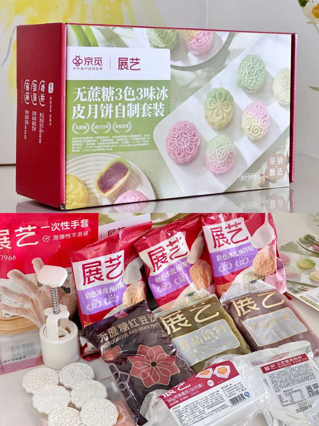 这次用了展艺的无蔗糖3色3味冰皮月饼自制套装!材料真的超级齐全,不仅有月饼包装,连手套也是配上了,真的很贴心。