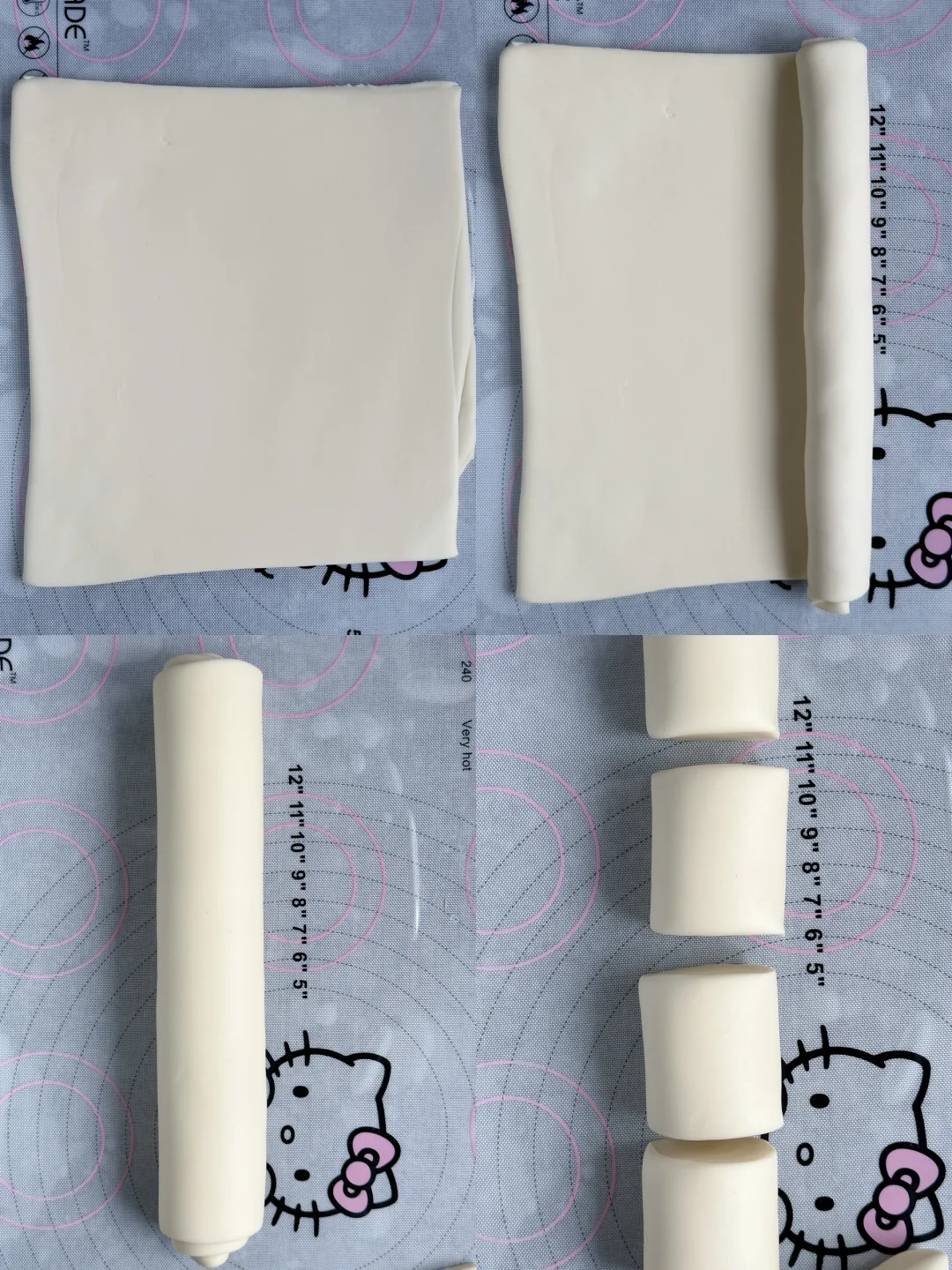 🔺揉好的面团擀成长方形面片,喷一点水,卷起来,切成段,整理一下边角。