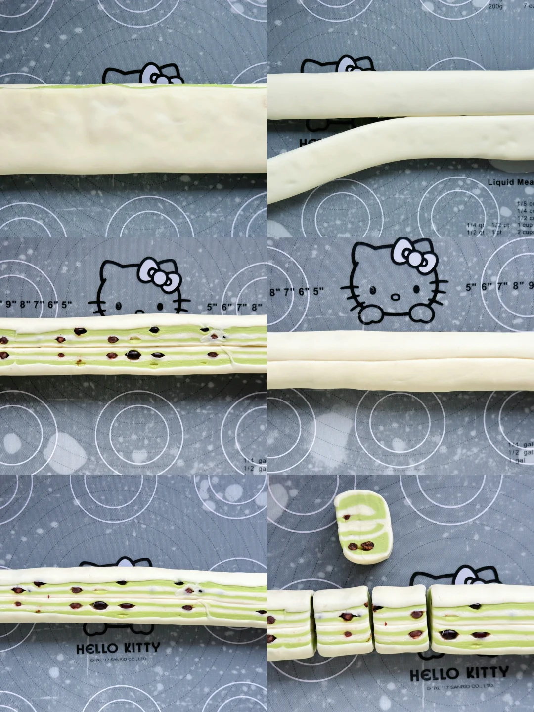 🔺揉好的面团擀成长方形光滑面片,喷一点水,叠起来,用擀面杖稍微擀大一点,表面撒上蜜红豆,上面三分之一处向下折叠,再撒适量红豆,下面三分之一向上折叠,稍微擀压紧实一点,从中间切开,两条叠在一起,切面朝上,切成段,整理一下边角。