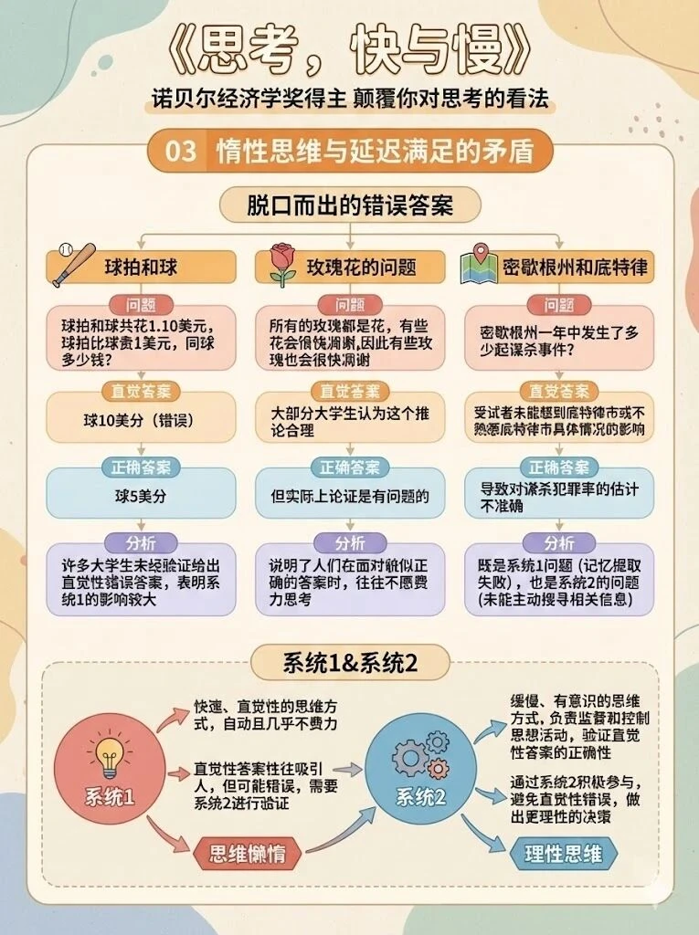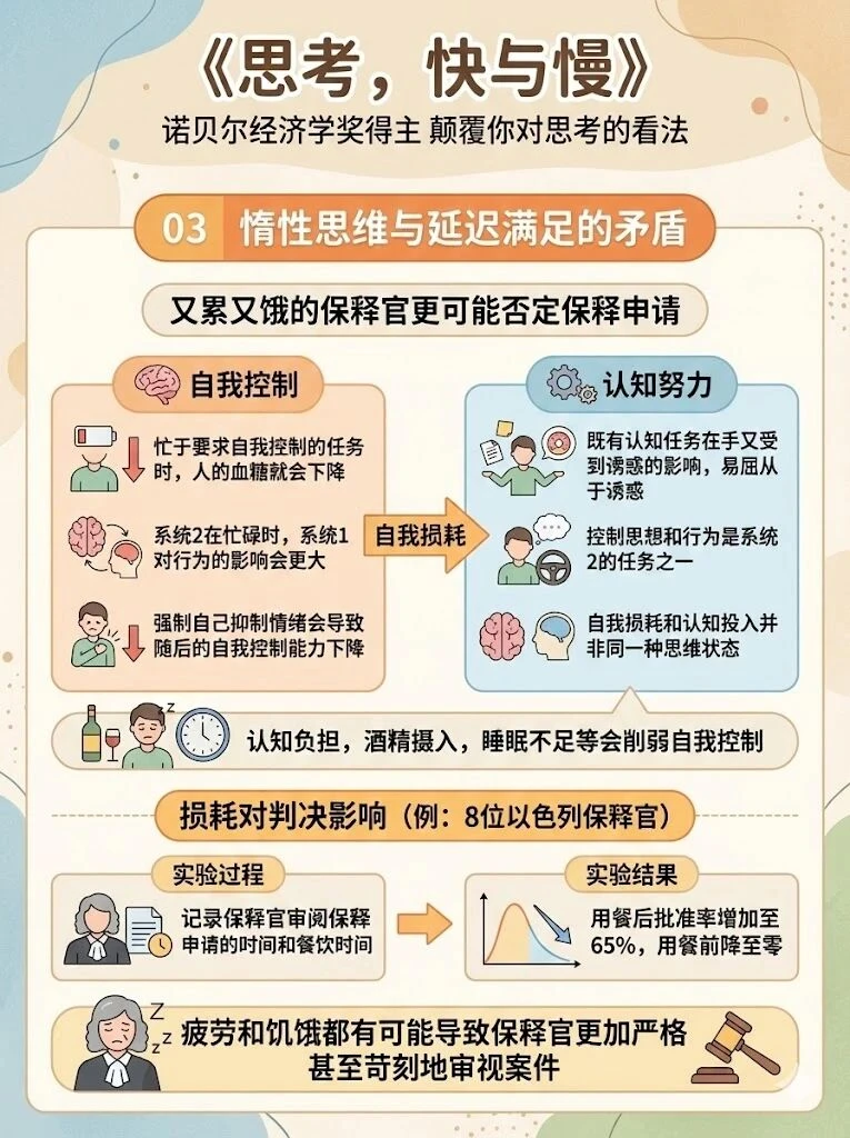 虚化所有人聚焦你 有没有过这种 “脑子掉线” 时刻🤯: 饿到眼冒金星时,连选奶茶都能选错常喝的口味;累到瘫在沙发上,明明要回工作消息,却鬼使神差刷了一小时短视频 —— 其实不是你笨,是你脑子在 “偷懒”! 《思考,快与慢》里这几个真相,直接戳中我: ❶ 又累又饿时,你的脑子是 “甩锅侠” 以色列保释官的实验太狠了: 👉 又累又饿时,保释批准率直接降到 0; 👉 吃完饭后,批准率立刻飙到 65%! 这就是 “自我损耗”:当你又累、又饿、睡眠不足时,负责理性的「系统 2」直接歇菜,把决定权丢给爱偷懒的「系统 1」(直觉)—— 就像你饿到暴躁时,会把 “领导没回消息” 脑补成 “他针对我”,本质是脑子懒得动了。 ❷ 你的脑子,有自己的 “摸鱼速度” 别不信:慢走(每英里 17 分钟)时你能灵感爆棚,快走(每英里 14 分钟)时连简单思考都卡壳;要是边快走边算 “23×78”,脑子能直接死机。 因为「系统 2」(理性)有自己的节奏 —— 不用逼它 “加速跑”,比如摸鱼散步时写方案,反而比坐在工位死磕高效,这就是 “心流状态”:不用硬撑意志力,注意力自动聚焦,还越干越爽。 ❸ 脱口而出的答案,90% 是错的 试试这个题: “球拍和球共 1.1 美元,球拍比球贵 1 美元,球多少钱?” 是不是第一反应 “10 美分”?❌ 正确答案是 5 美分! 这就是「系统 1 的懒」:它爱凭直觉甩答案,根本不想动脑子算;而负责较真的「系统 2」,早被 “怕麻烦” 按在了沙发上。 现在我学乖了: ▫️ 饿、累、熬夜时,绝不做任何决定(哪怕是 “今晚吃什么”); ▫️ 想创意就慢走摸鱼,做复杂表格就坐定不挪窝; ▫️ 脱口而出答案前,逼自己多问一句 “真的是这样吗?”