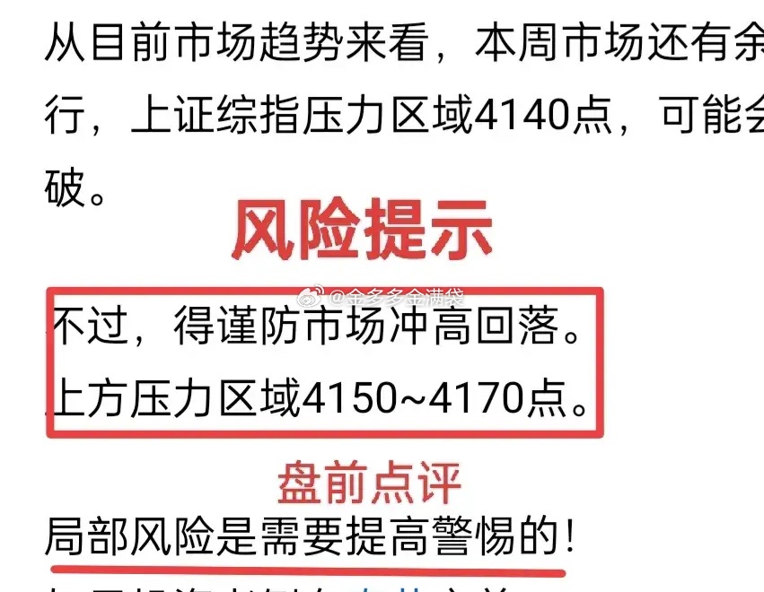 A股:今天开盘前,金姐提示大盘谨防冲高回落!同时提醒,局部区域风险大!市场调整并非完全是坏事!金姐周末说过,很多人不相信市场会调整,调整就可能在不经意间落地。1,教训欲望和风险,是相辅相成的。有些普通投资者,只有当锤子已经砸下来后,才会感觉到痛。商业航天板块再次出现跌停潮,板块内还能红盘的个股也就30几只,跌幅5%以上的股票比比皆是!金姐上周(包括周末)讲过不下三次,商业航天板块的反弹,是主力自救行情,参与反弹要谨慎!有些人认为,商业航天板块的反弹是第二波行情要来了,上周五迫不及待地追高进场。2,大盘今天开盘前,金姐表达过对大盘的看法:大盘有冲高机会,能越过4140点,但要谨防冲高回落!阻力区域在4150~4170点。市场的发展,与金姐的预期基本相似。今天开盘4144点,最高4160.99点。上证综指今天能够维持相对稳定,老登们是成出了力的。茅台9连阴之后反弹,银行券商板块护盘。正应了金姐周末说过的,物极必反。从分时走势看,上证综指大体上在一个箱子里运行。这个箱子被击穿之前,大盘短期还能苟着。3,策略大盘调整不完全是坏事!管理层出手降温市场,并非是要把市场掐死,他们是对题材垃圾股非理性上涨看不过眼。大盘哗哗下跌,不是他们的选项。高标题材股的风险将继续释放。而对于中低位的股票来说,可能反而是逢低吸纳的机会。个人观点,仅供交流,不构成投资建议!理财有风险,投资需谨慎!A股行情A股指数大盘要跌吗