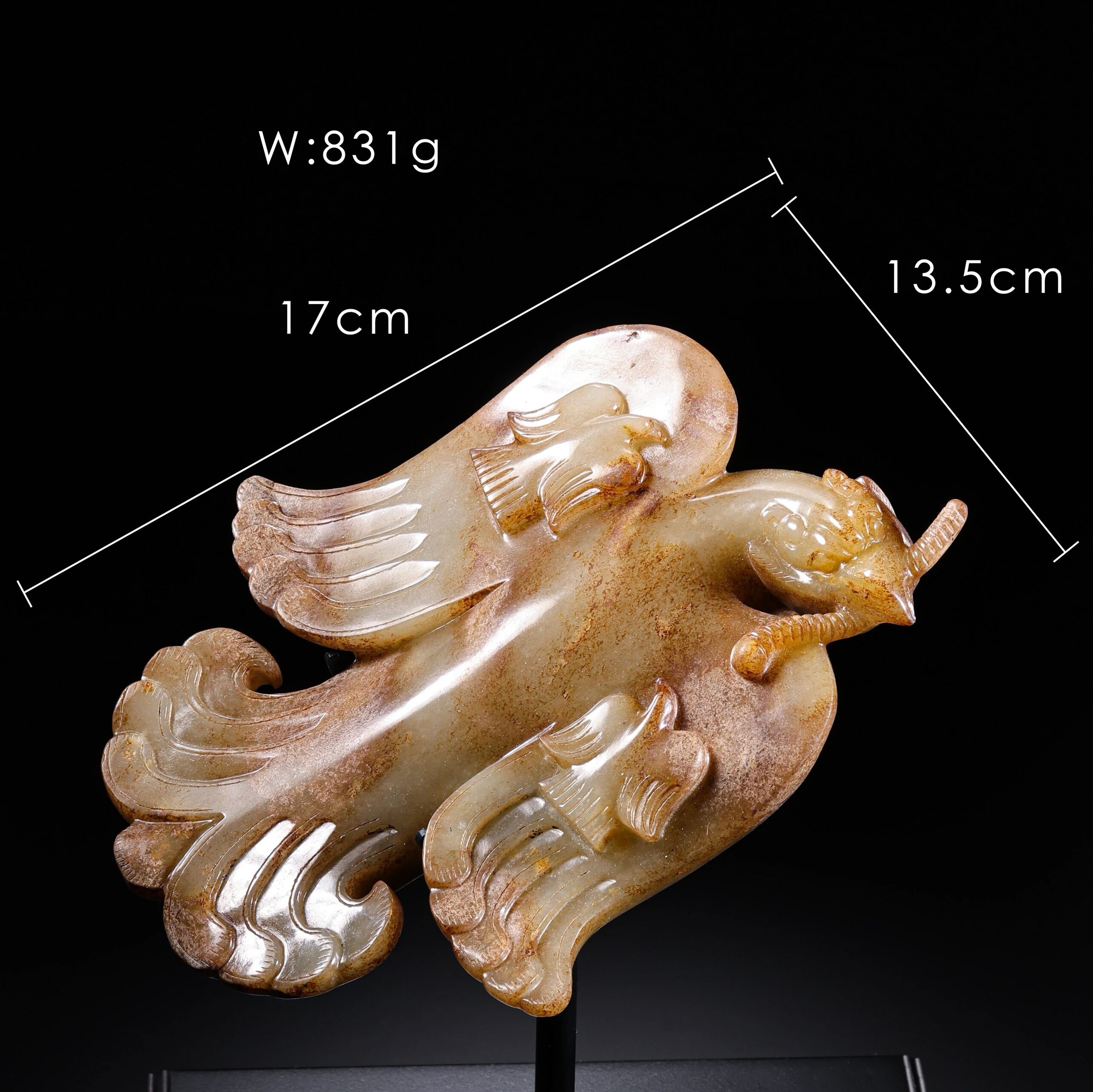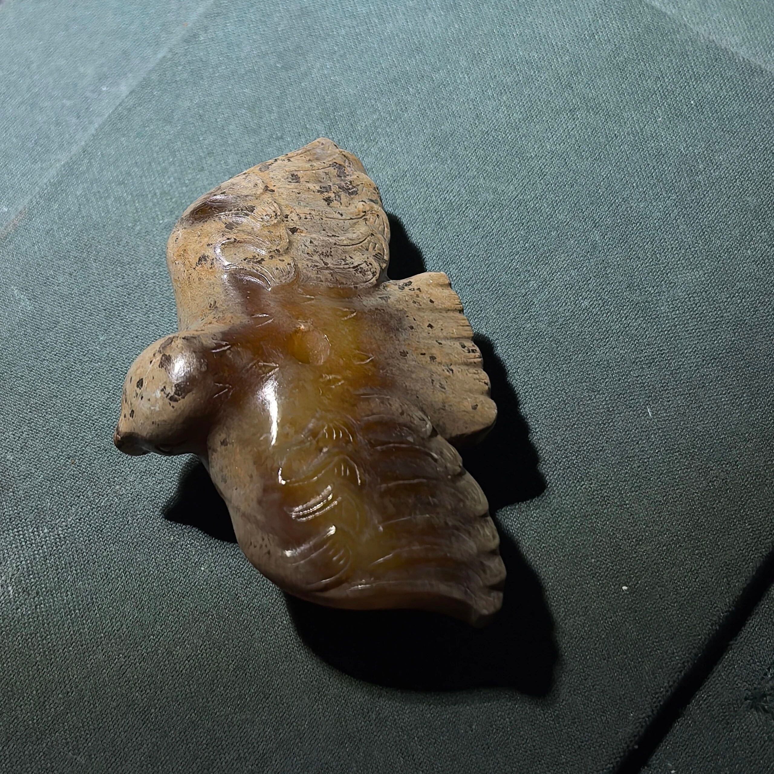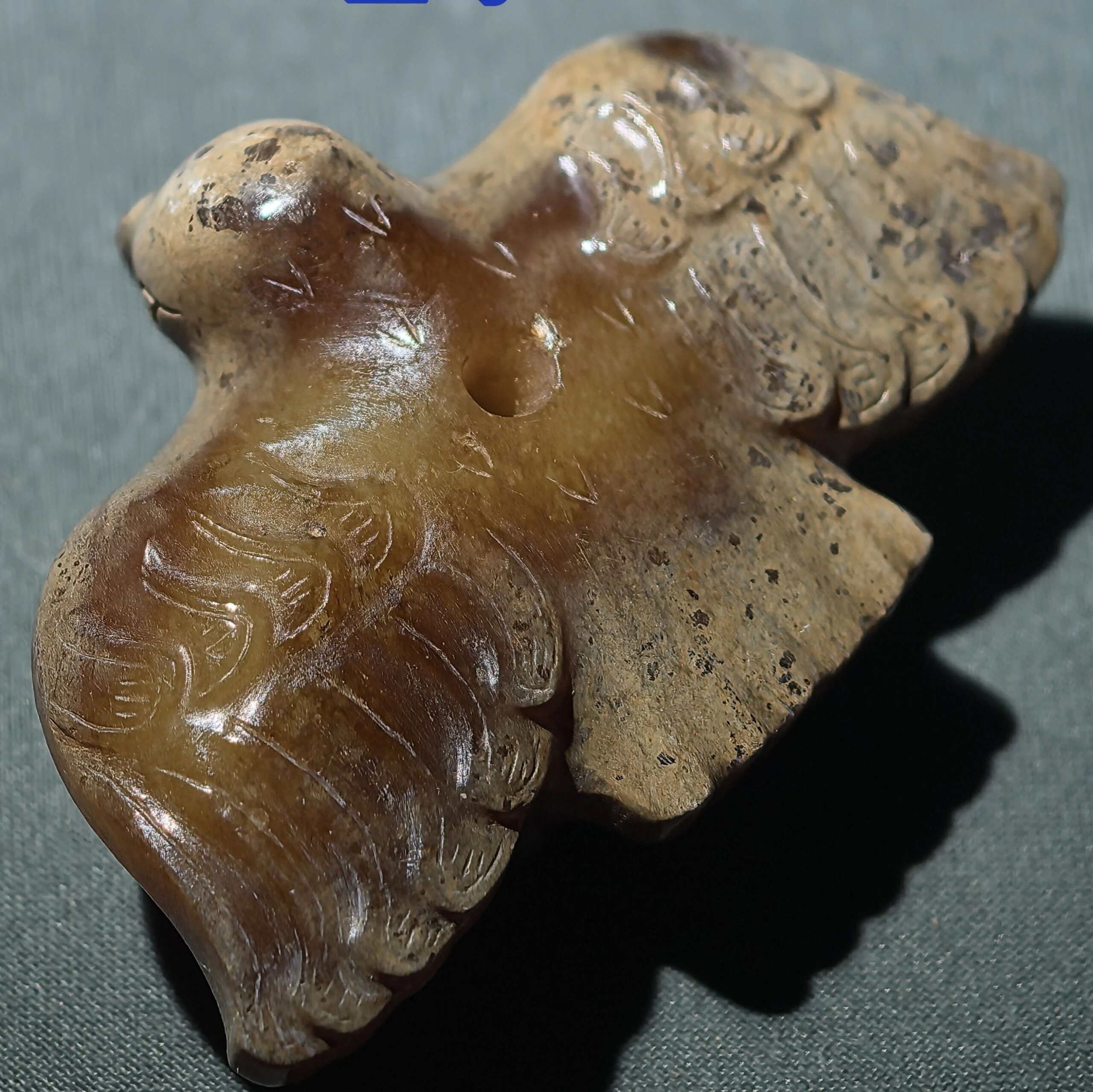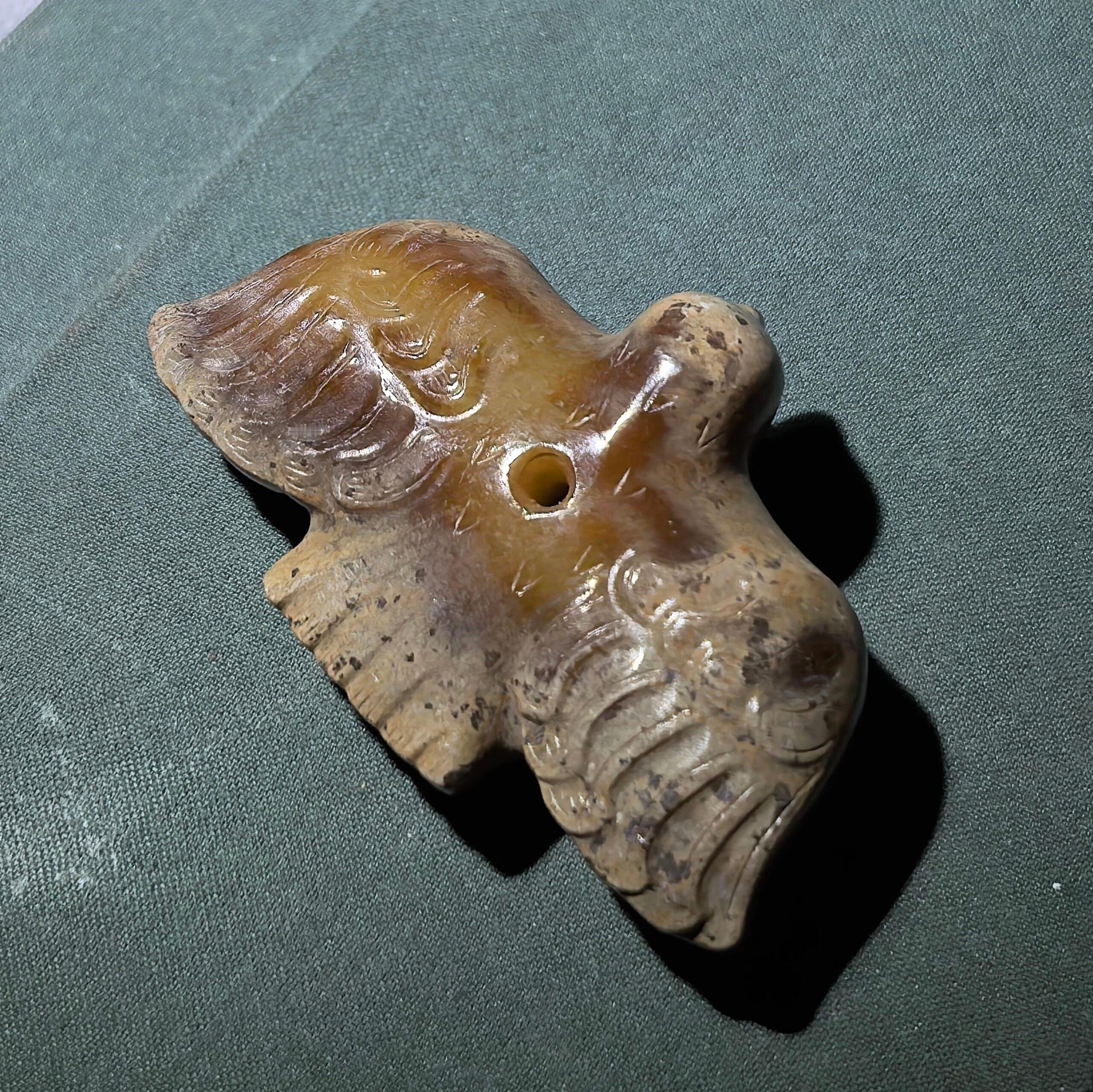 古玉杂谈 汉代凤鸟式样很多,不是越雕工复杂越好,也不是雕工简单的就一定不上当次,凤上加凤,雕琢难度相对高些。下图凤鸟背上有孔,穿一根绳子吊起来,能看出飞翔时的平衡度,现在的仿品估计做不到…… 上海