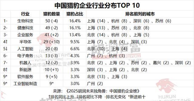 2025年,胡润研究院在中国找到304家猎豹企业,这些企业分布于39个城市,平均“年龄”约为10岁。生物科技、健康科技、企业服务、半导体及人工智能五大领域的企业合计占比超六成。85%为B2B企业,仅有15%直接面向消费者。