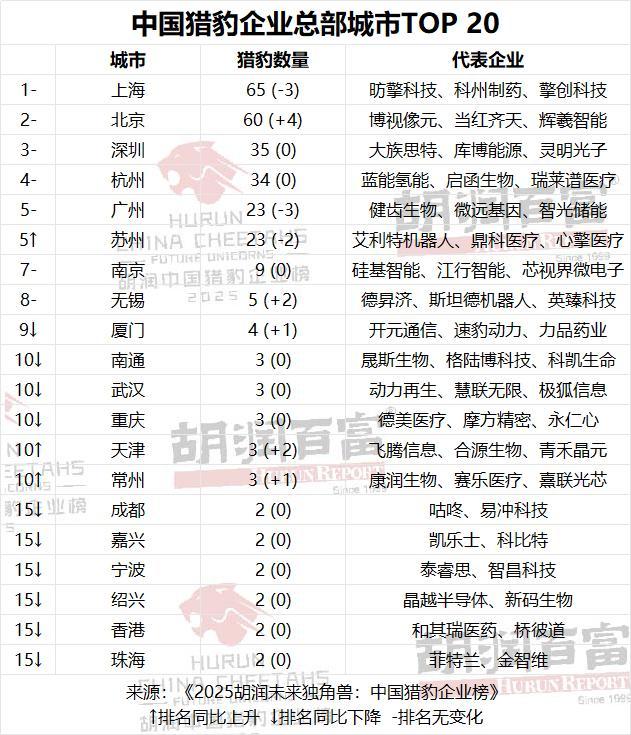 榜单显示,上海依旧是中国猎豹企业数量最多的城市,总计65家;北京是今年增长数量最多的城市,增加了4家,以60家位居第二;深圳和杭州分别以35家和34家位列第三和第四;表现较好的城市还有无锡和天津,分别增加了2家;天津和常州则是今年新进前十的城市。